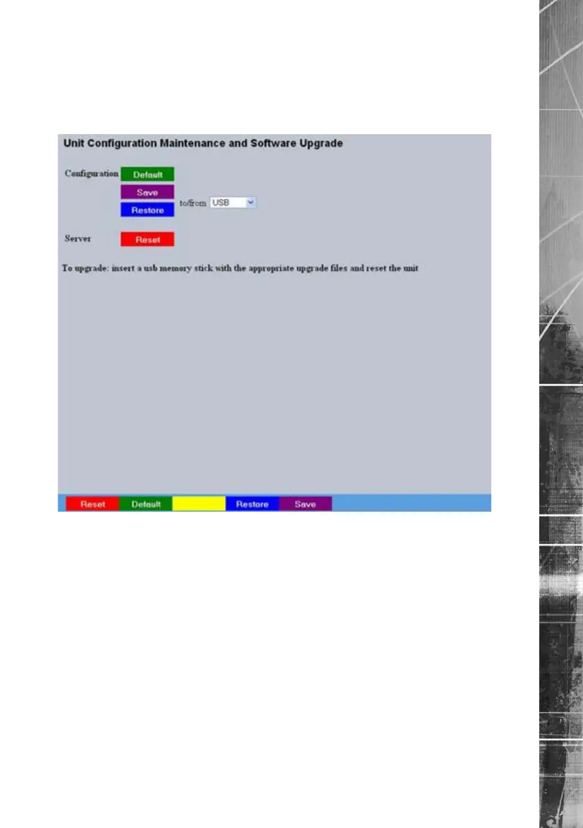 This menu allows the unit to be reset and a software upgrade to be performed via an inserted