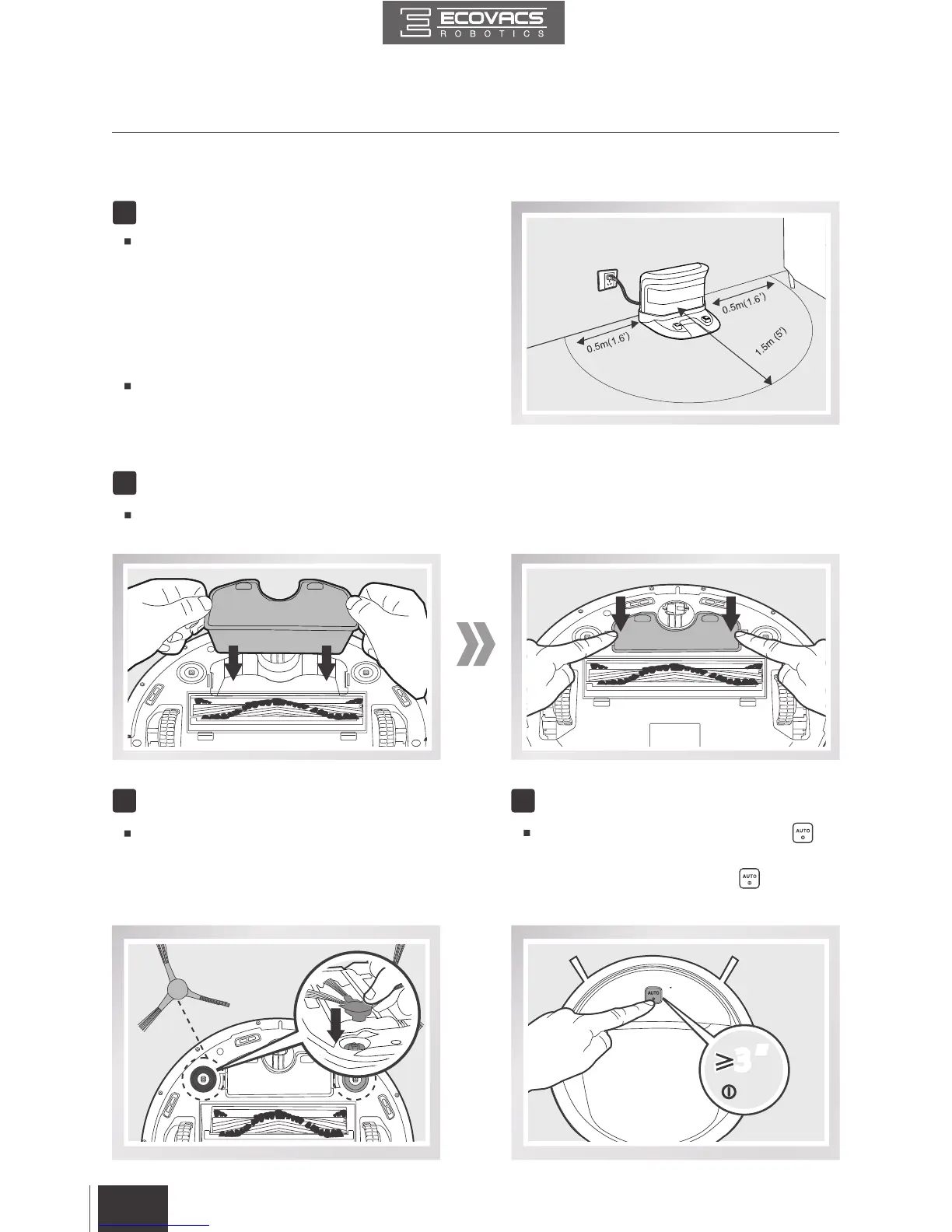 Installez le bloc-pile dans la fente y étant destinée au bas du DEEBOT. Appuyez sur le bloc-pile