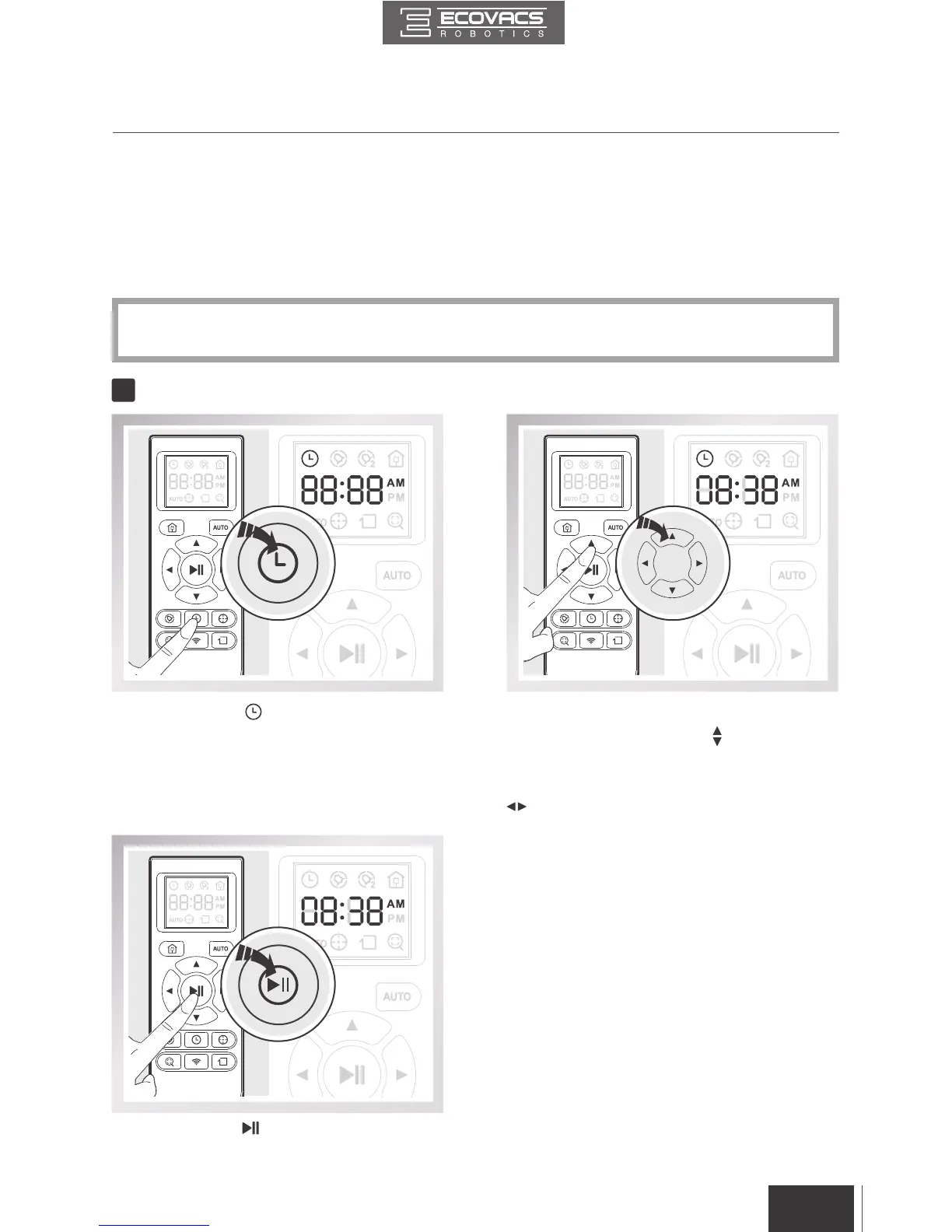 casa, mediante el control remoto o la aplicación ECOVACS. La hora actual del día y el tiempo de