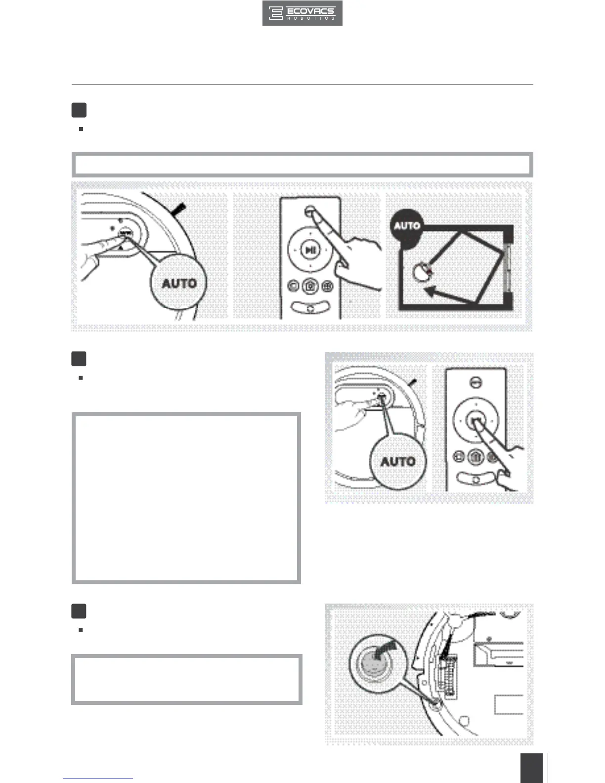 Press the AUTO Mode Button on DEEBOT or on the Remote Control. DEEBOT starts to work