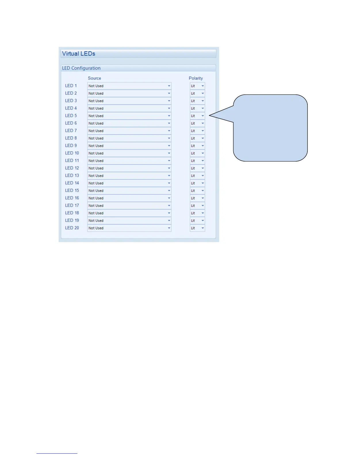 The list of output sources available for configuration of the module Virtual LEDs is listed in the section entitled