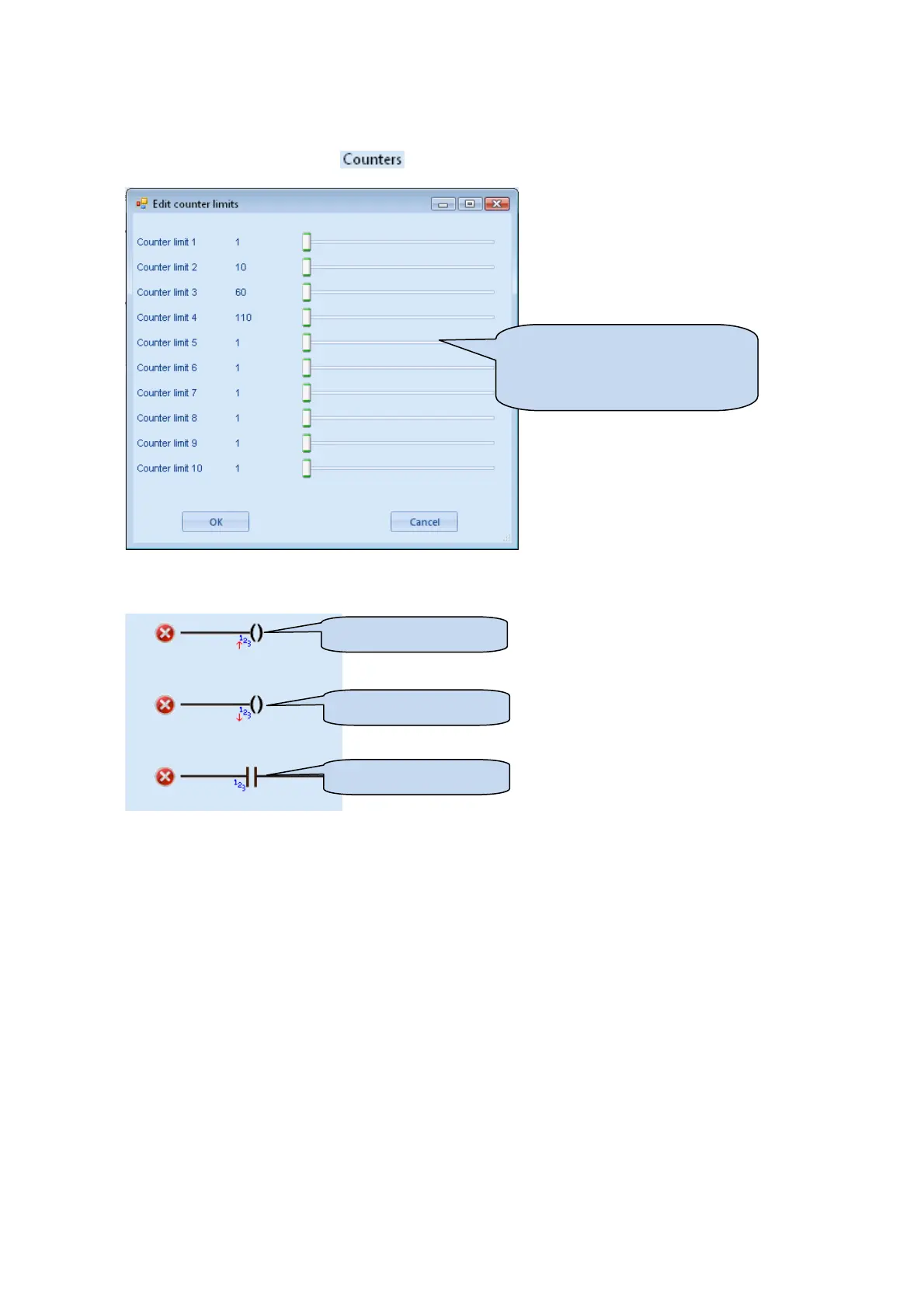 A counter is configured by clicking in the menu bar. The ‘Edit counter limits’ window appears.