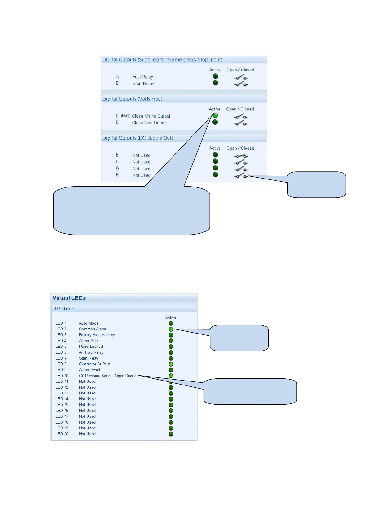 not physical LEDs. They are provided to show status and appear only in the SCADA section of the