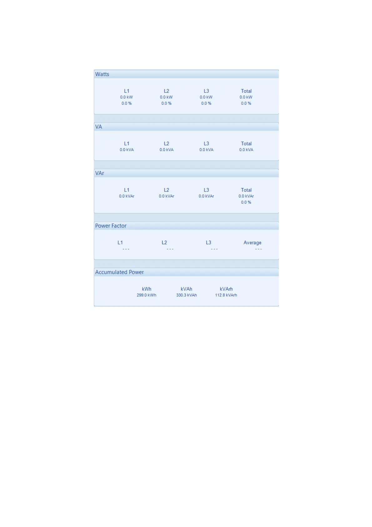 Shows the modules measurements of the mains supply power