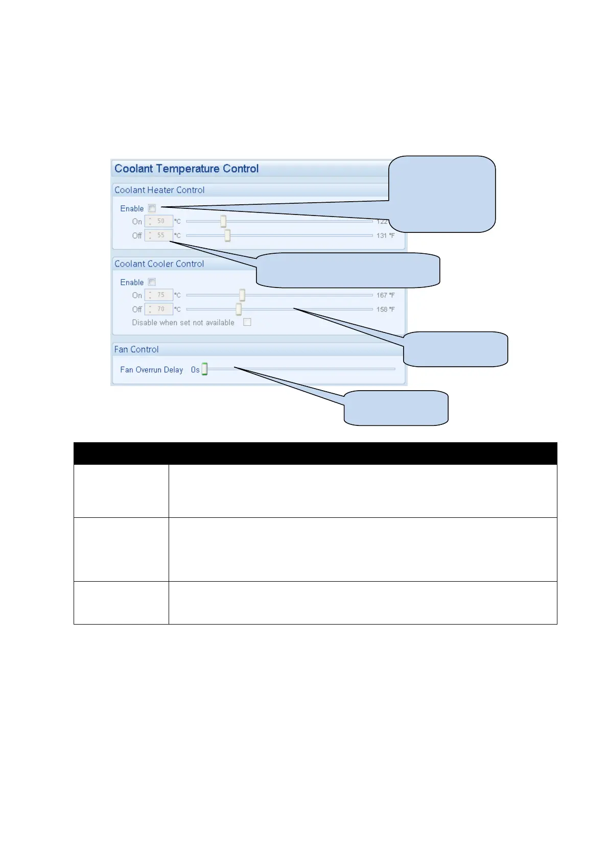 The Coolant temperature control settings provide for control of coolant heaters / coolers using the Coolant