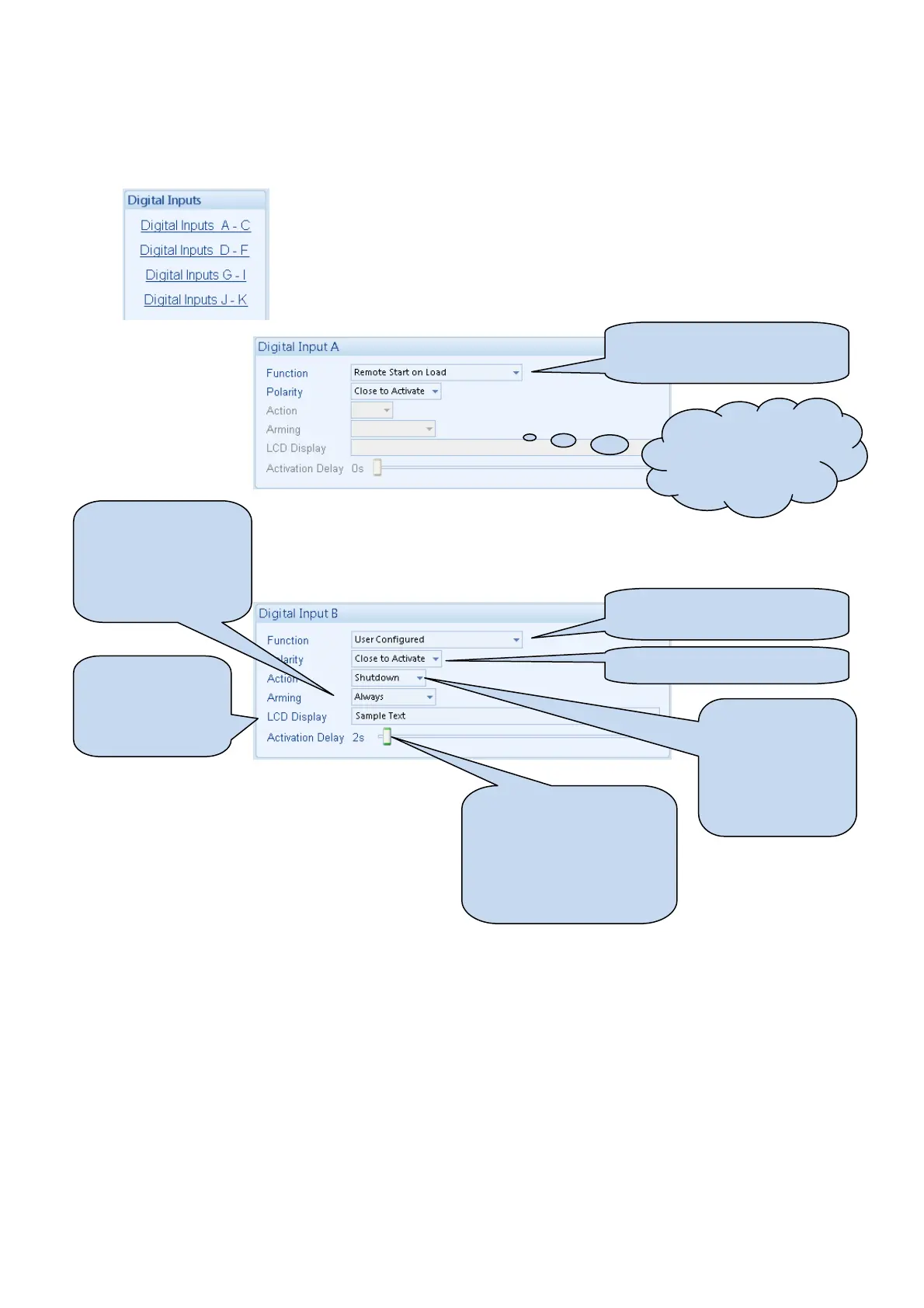 The digital inputs page is subdivided into smaller sections.