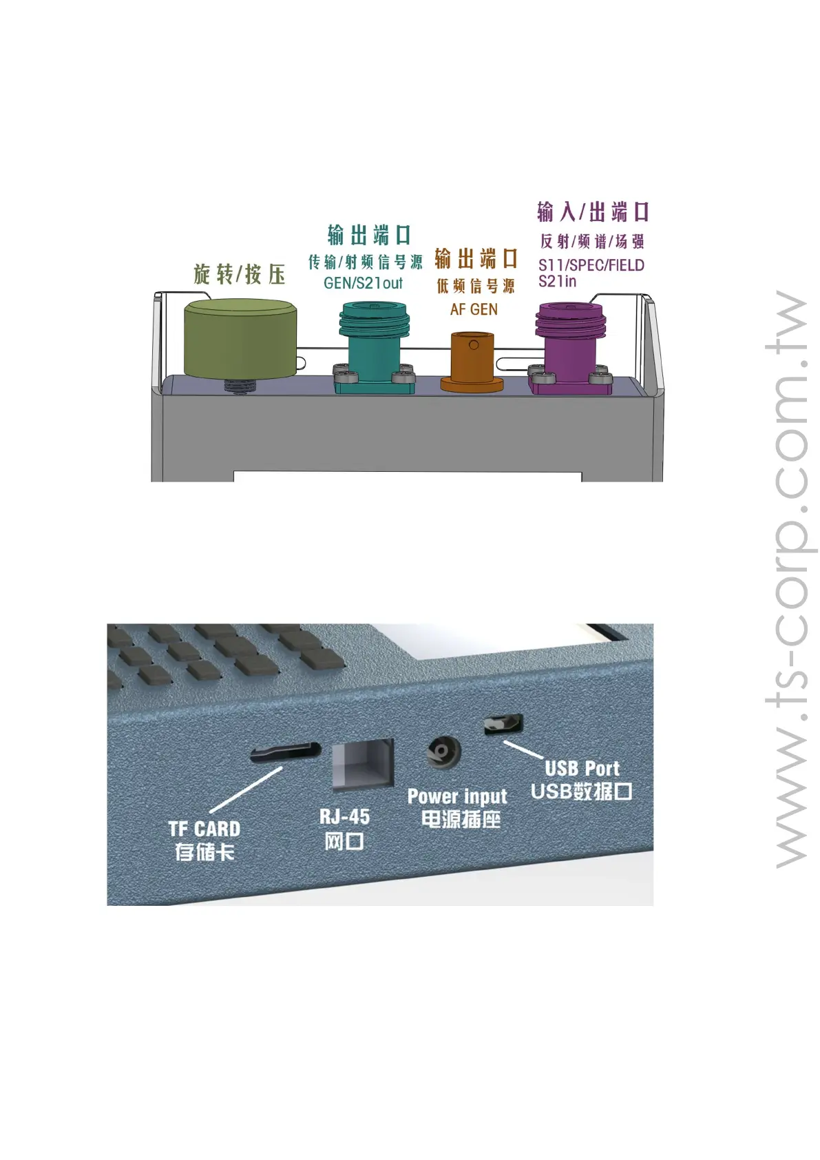 right: TF card slot, RJ45 Ethernet port, power input jack, and USB port. (Shown as
