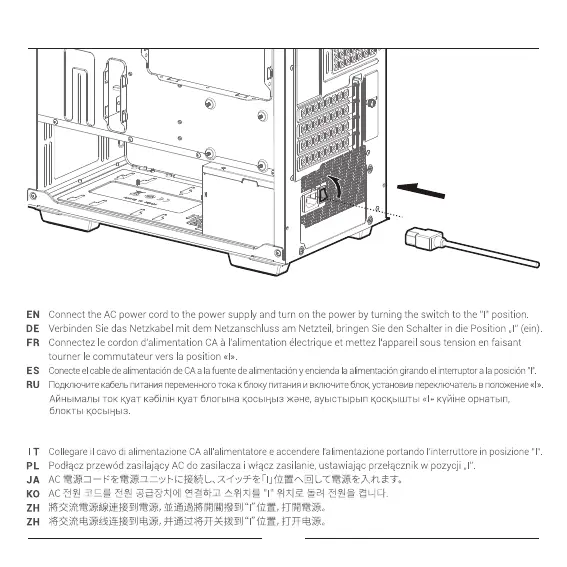 Conecte o cabo de alimentação CA à fonte de alimentação e ligue a alimentação girando a chave para a posição“I”.