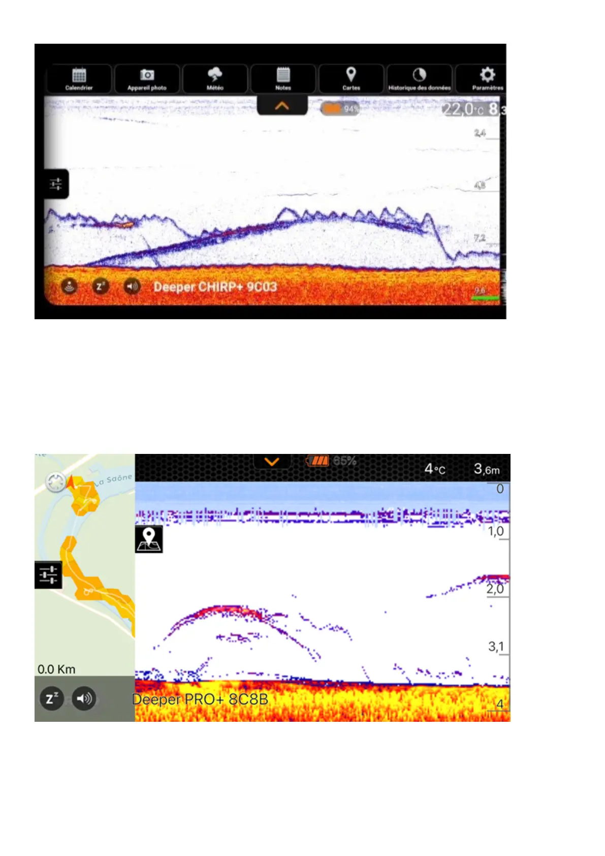 On this scan, you can see a catfish chasing a bait during vertical jigging. You can see that the signal from the