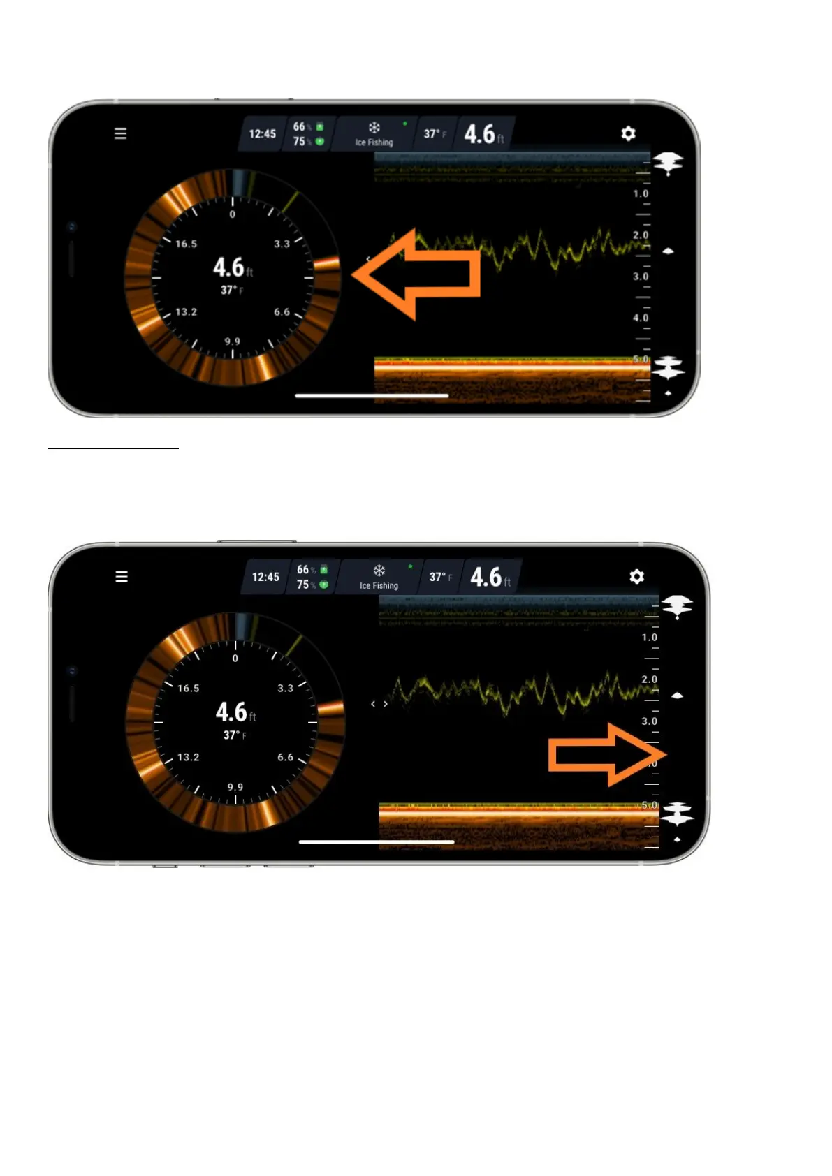 the bottom. Any lure, jig or fish will be shown in between these two as moving white bands. The size and thickness