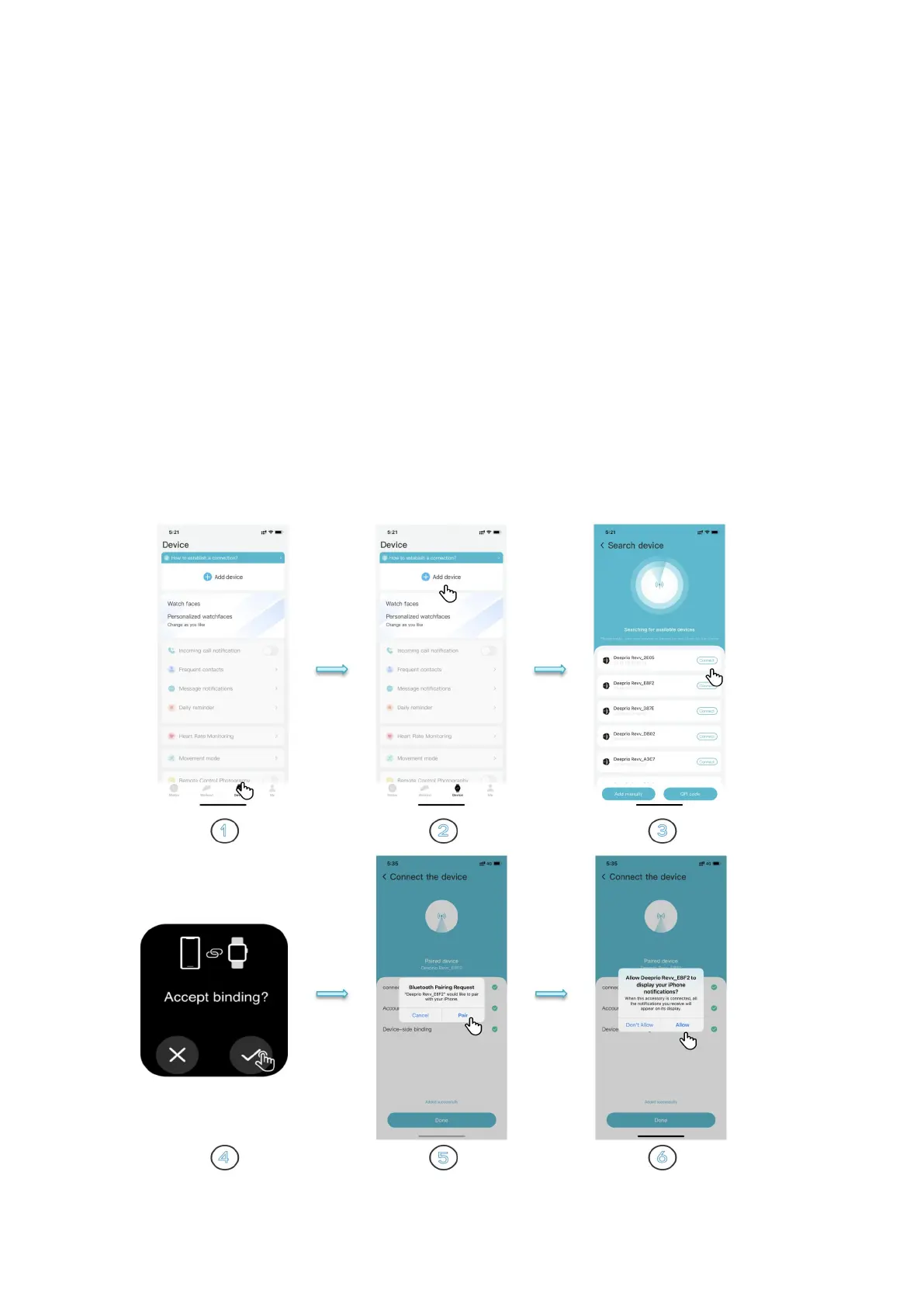 (2) Add manually > Select Deeprio Revv > Connect your device > Select "√ "on the watch.