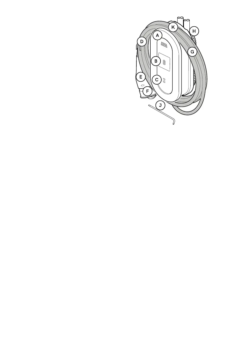 A. Latausyksikkö, B. Näyttö, C. RFID-lukija, D. Kaapelin pidike, E. Pistoke, F. Suojatulppa, G. Kaapeli, H. Seinäkiinnike, J.