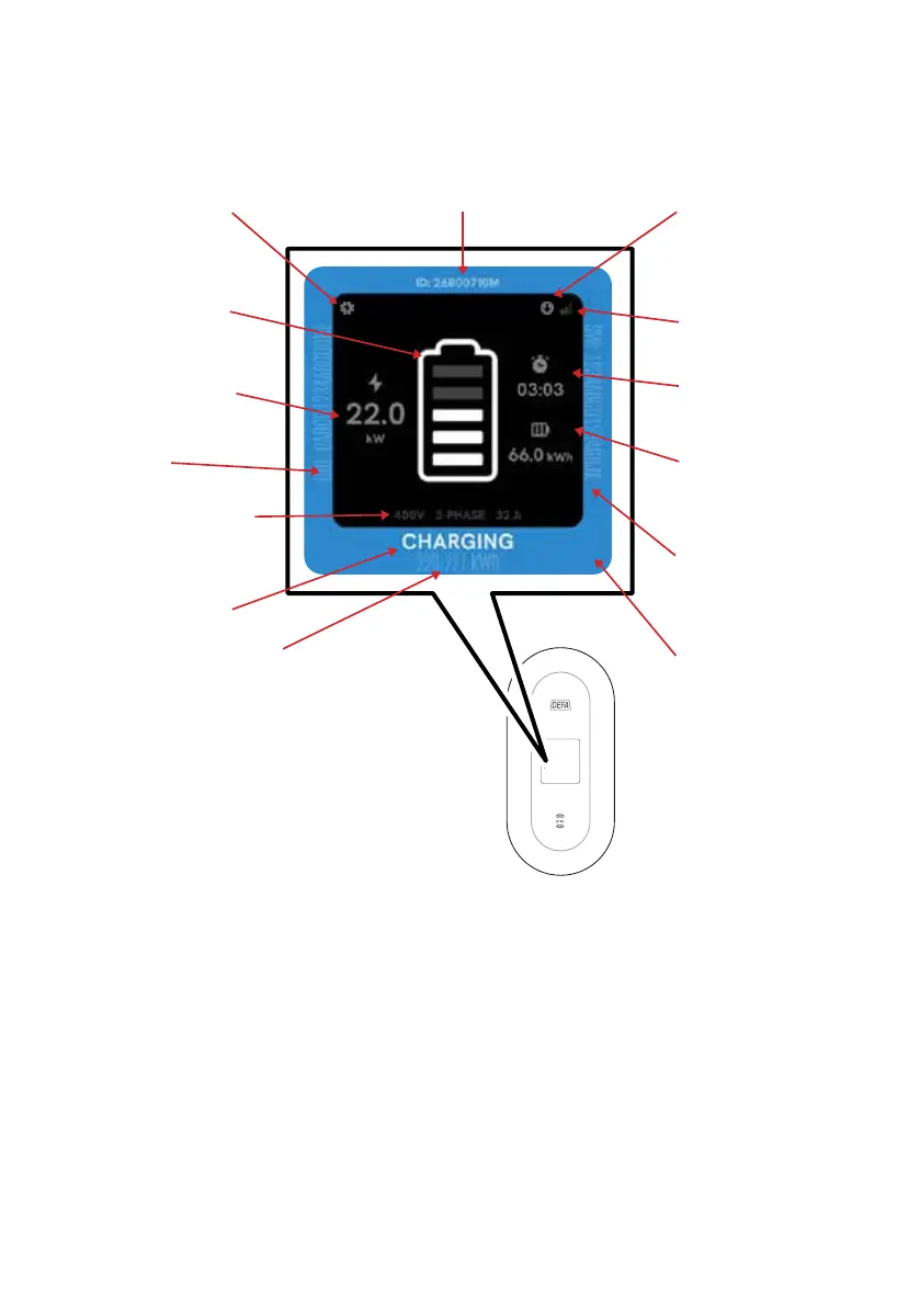 Statusmeddelelse. 7. kWh brugt siden første opladning. 8. Ladestations-id 9. Downloader rmwareopdatering. Er kun synlig