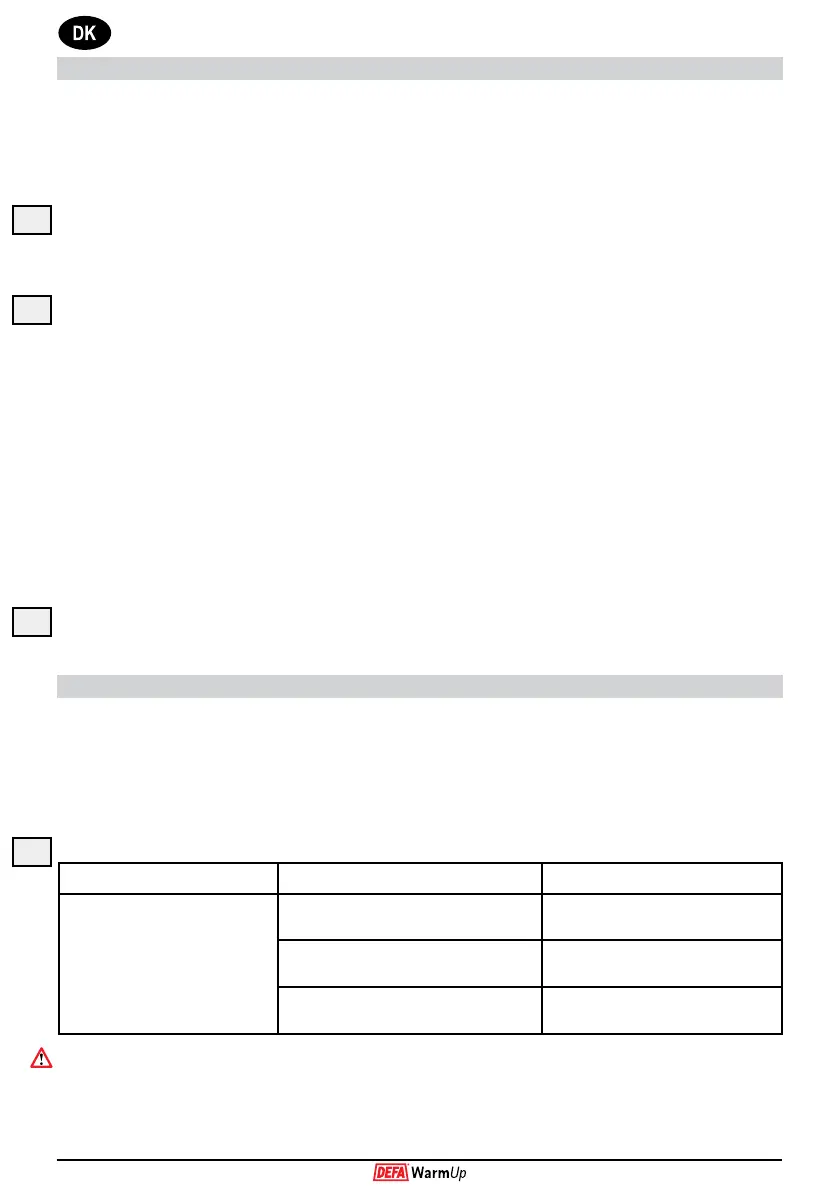 Skemaet nedenfor viser årsag til og udbedring af fejl, som kunne opstå med DEFA WarmUp.