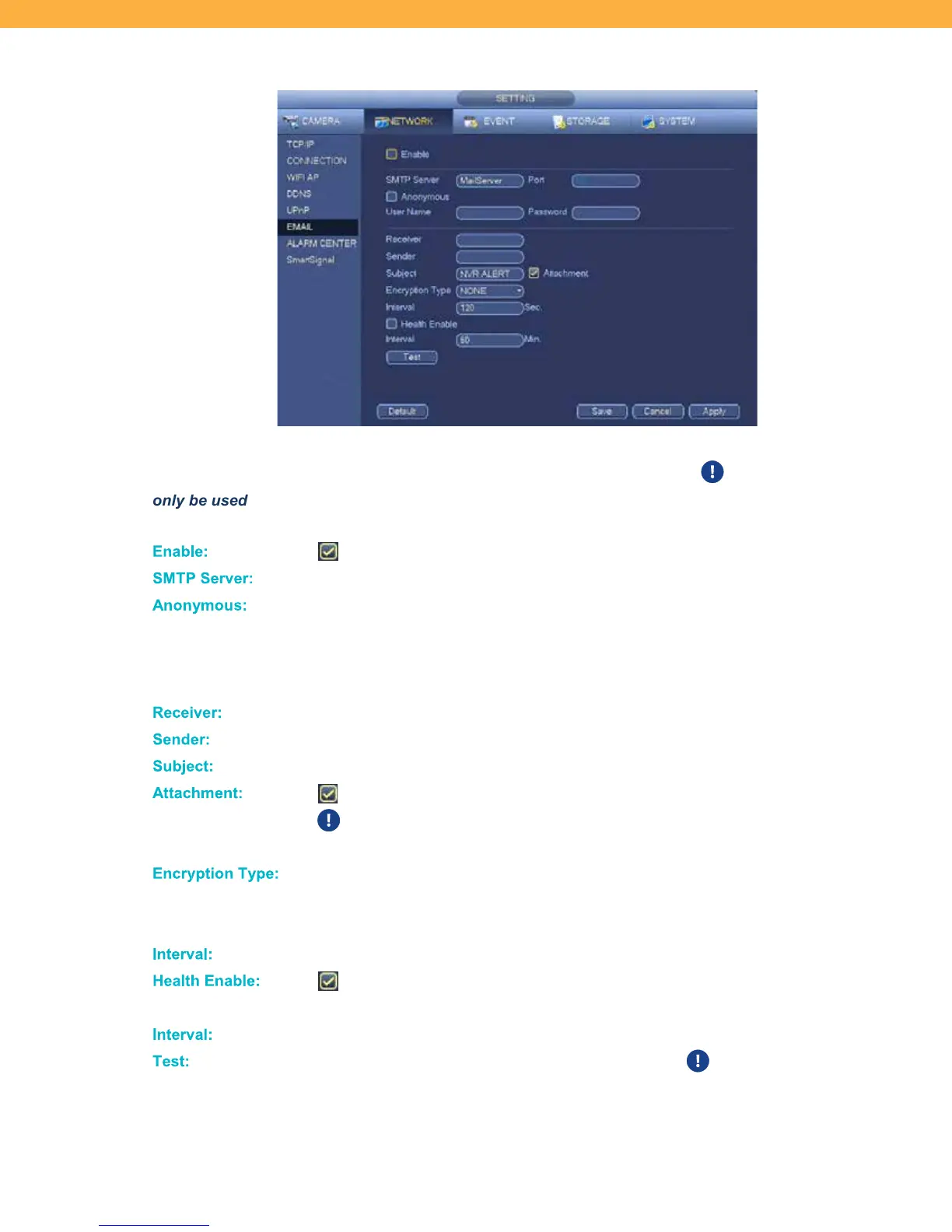 Setup Emails to be sent based on NVR Alerts. SMTP server connection details are needed to setup email