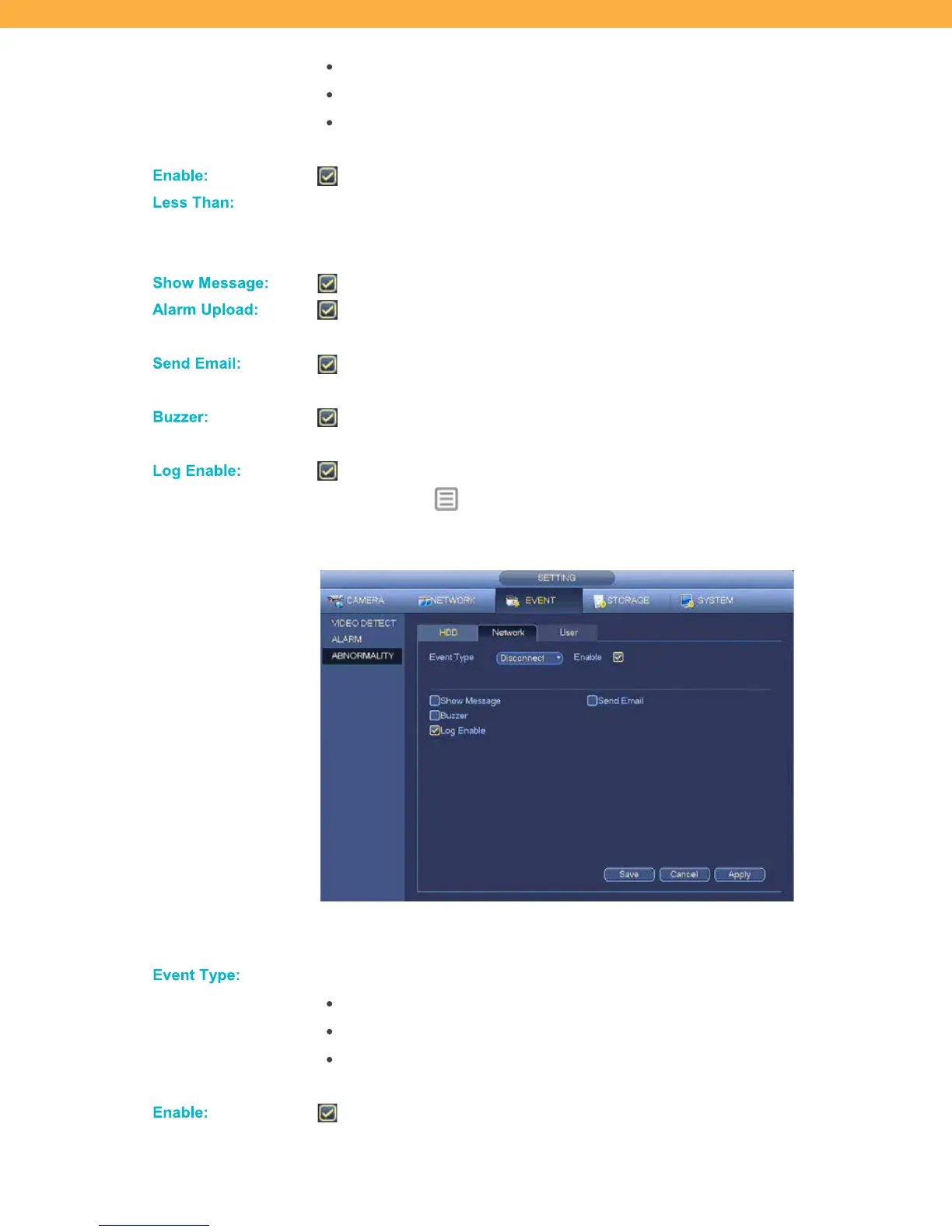 Network Abnormality settings allow you to select how the system will react when an issue is detected with