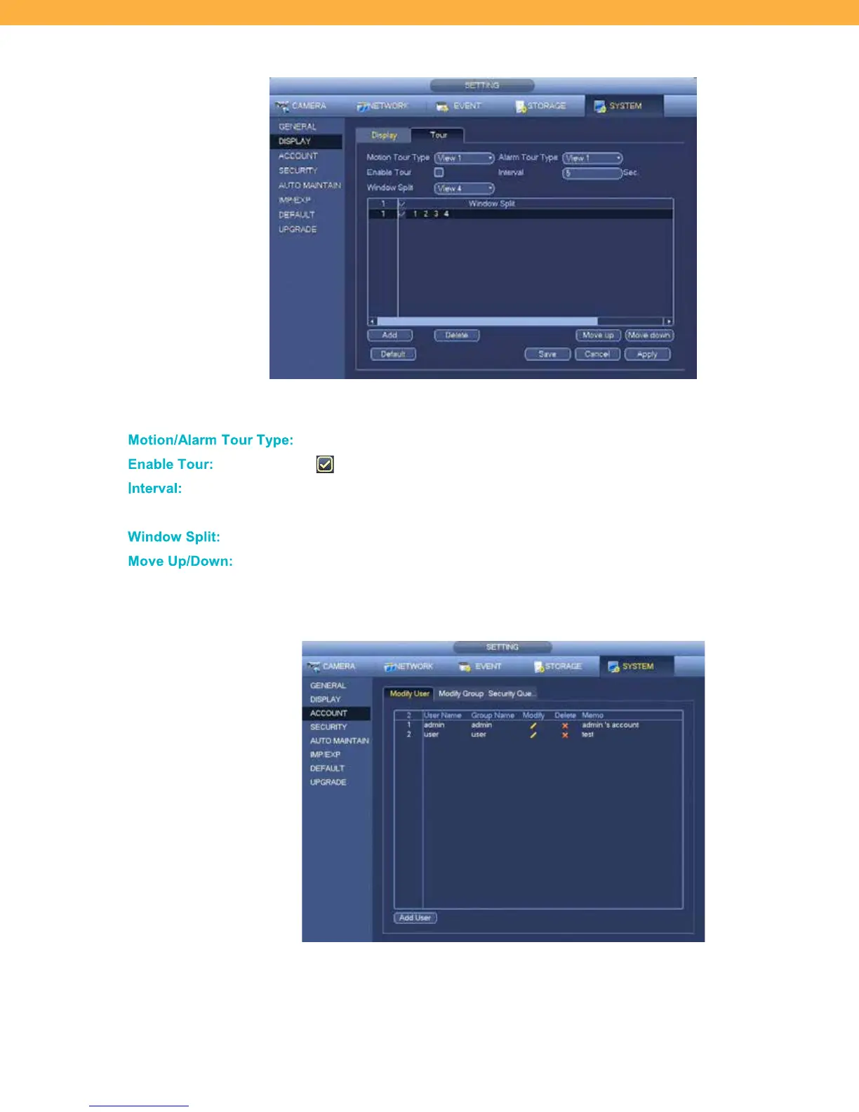 Tour allows you setup tour intervals, window splits, and motion/alarm tours for PTZ cameras.