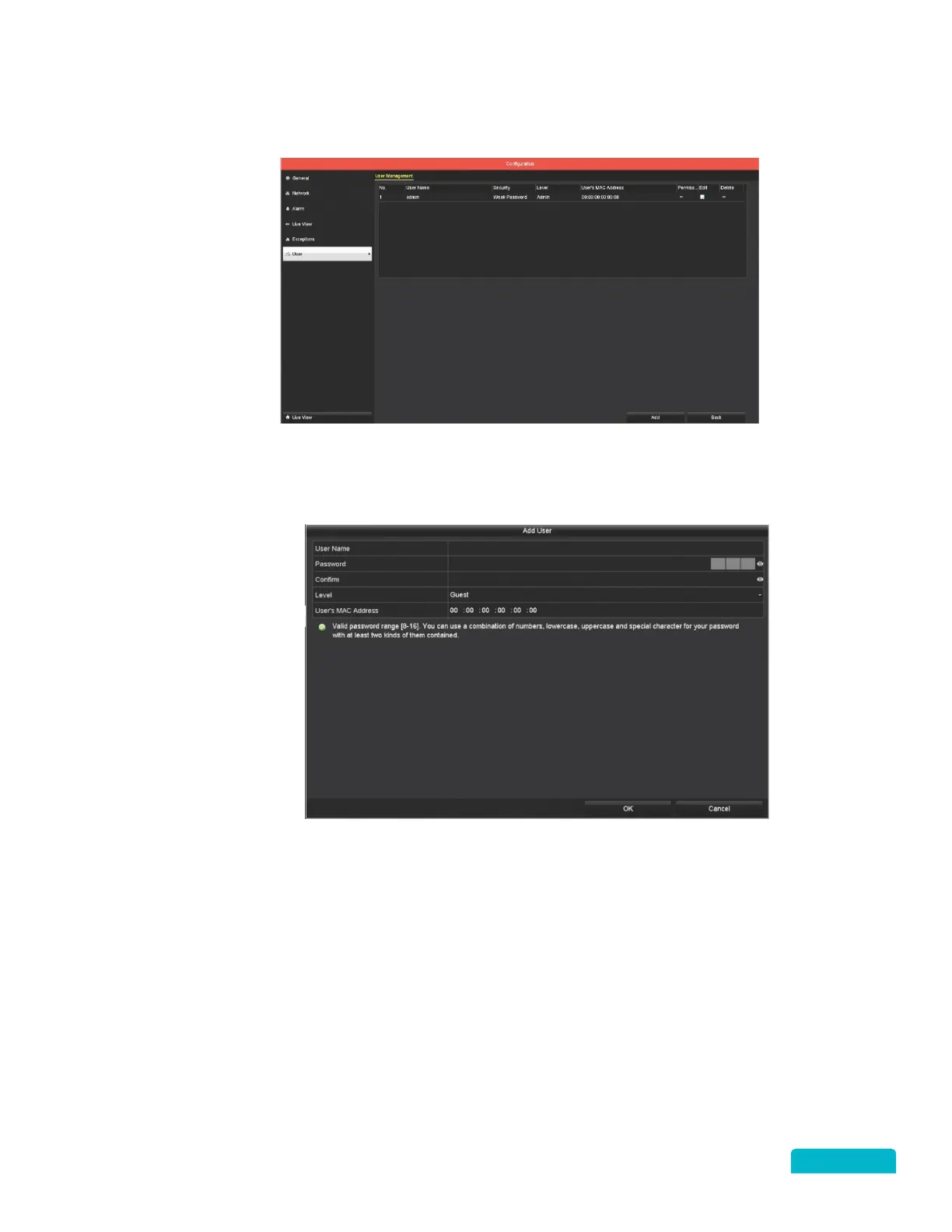 • Guest: User will be able to see the Live View screen and Playback recorded footage.