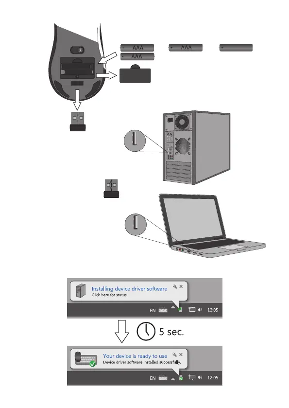 Defender Auris MB-027 - Setup and Connection; Battery Installation; USB Receiver Connection; Automatic Driver Installation