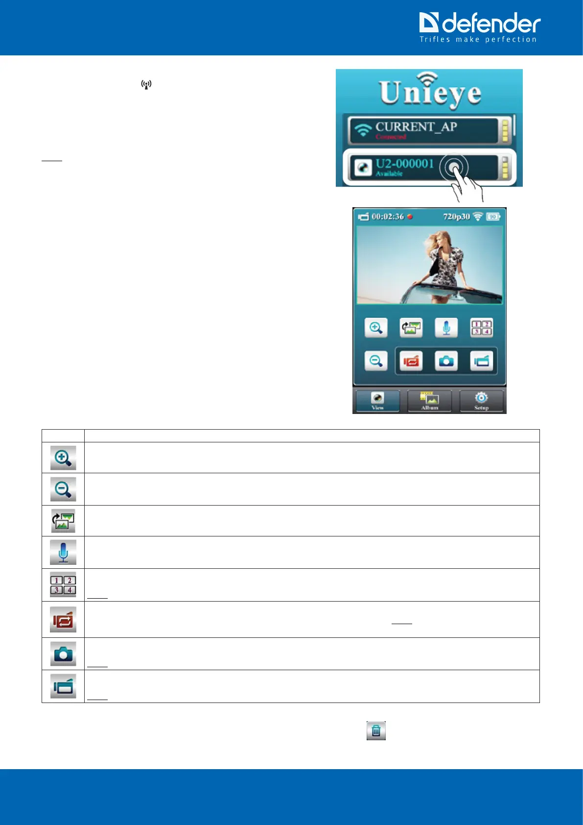 At the "Album" tab of the "Unieye" application you may see, delete (button ) and upload to the mobile device