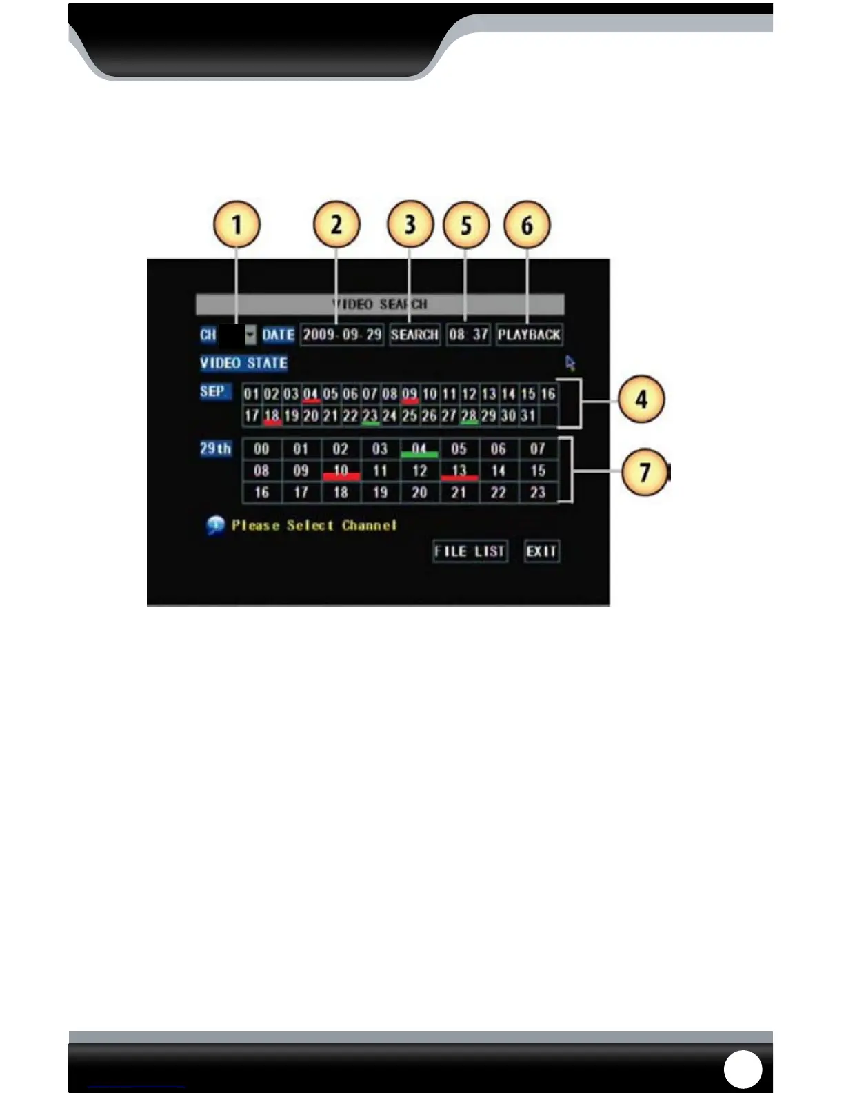 1. Select the channel you would like to view recorded footage from (1) and press select. Then, highlight and select a