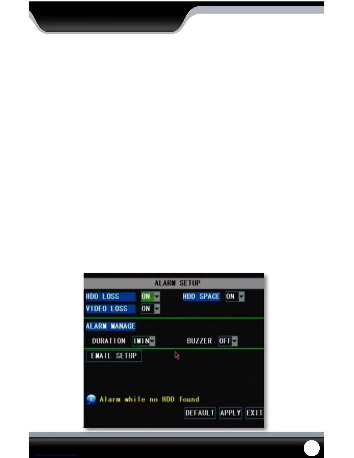 1. In the alarm menu go to the alarm notication(s) you would like to be notied on (HDD LOSS, HDD SPACE, VIDEO