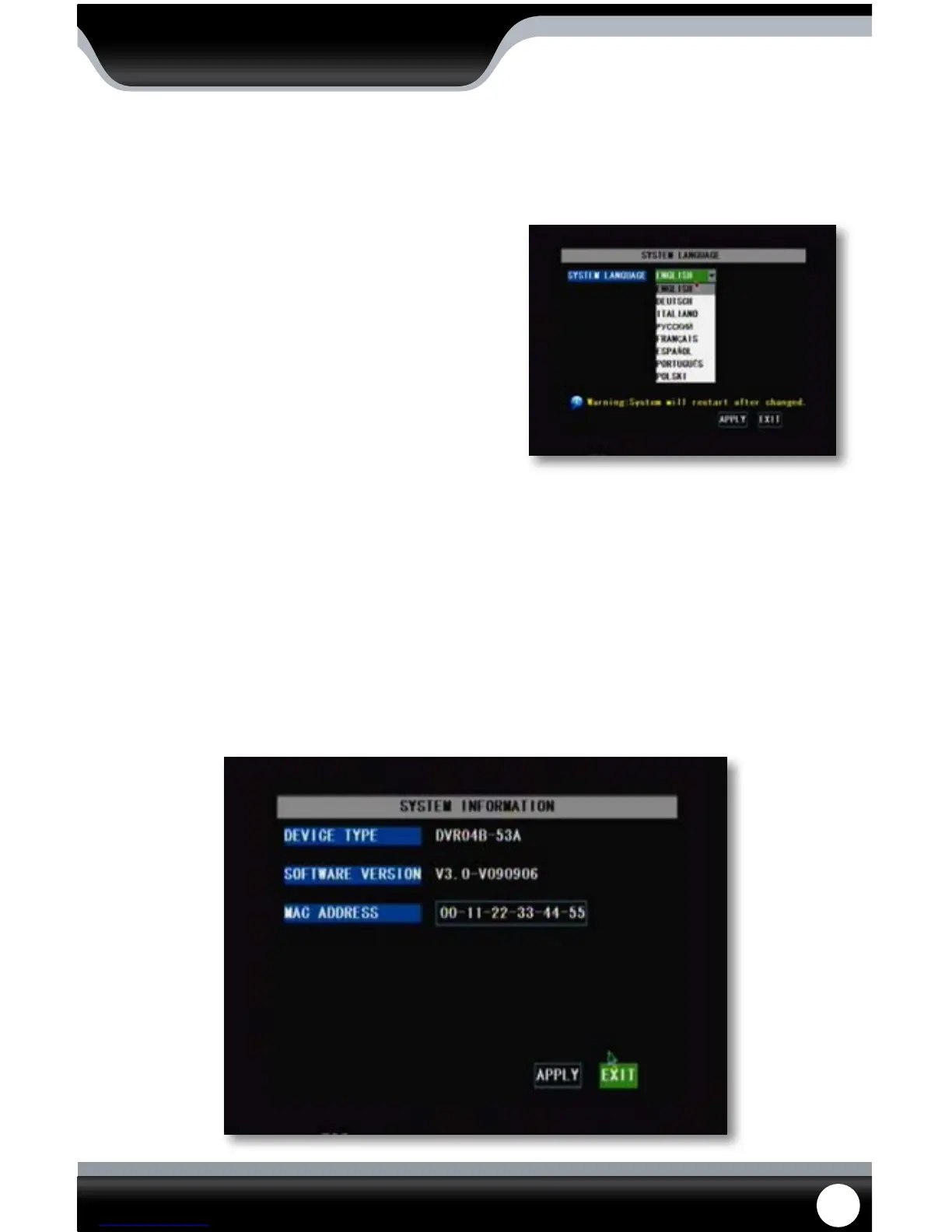 This DVR allows you to set many dierent languages. The languages you have to choose from include: English, Dutch,