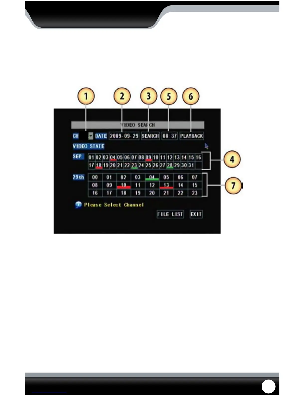1. Select the channel you would like to view recorded footage from (1) and press select. Then, highlight and select a