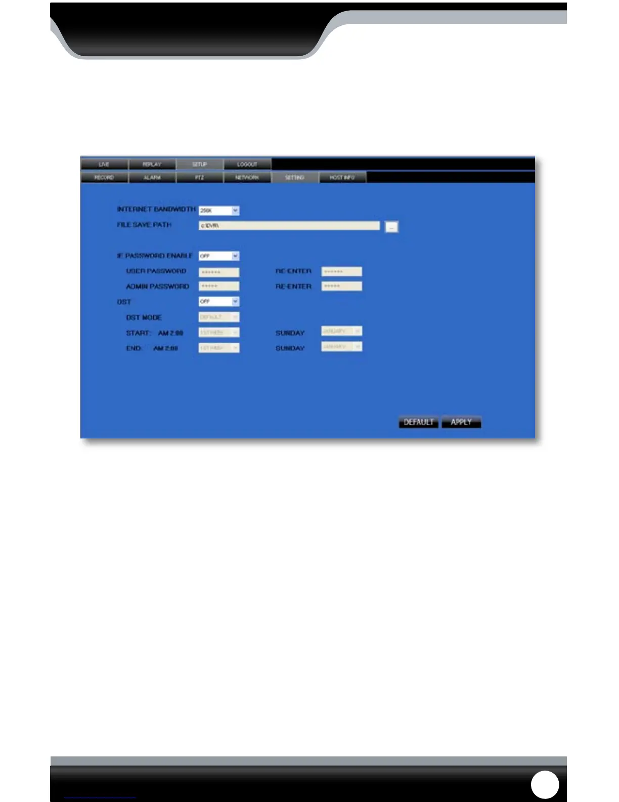 include the Internet bandwidth, the le save path, password enable, changing the password, and daylight savings