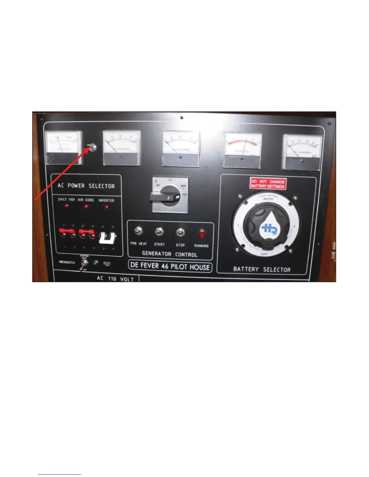 The top portion of the AC and DC Power Panel. The switch (arrow) between the meters switches the voltmeter to circuit #1 (up) or #2 (down).