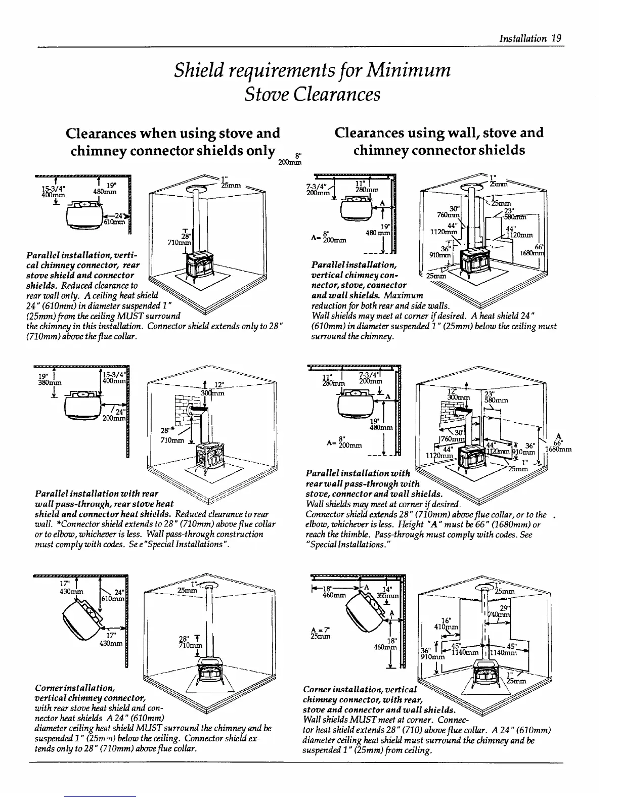 Defiant Encore 2140 - Clearances When Using Stove and Chimney Connector Shields Only; Clearances Using Wall, Stove and Chimney Connector Shields