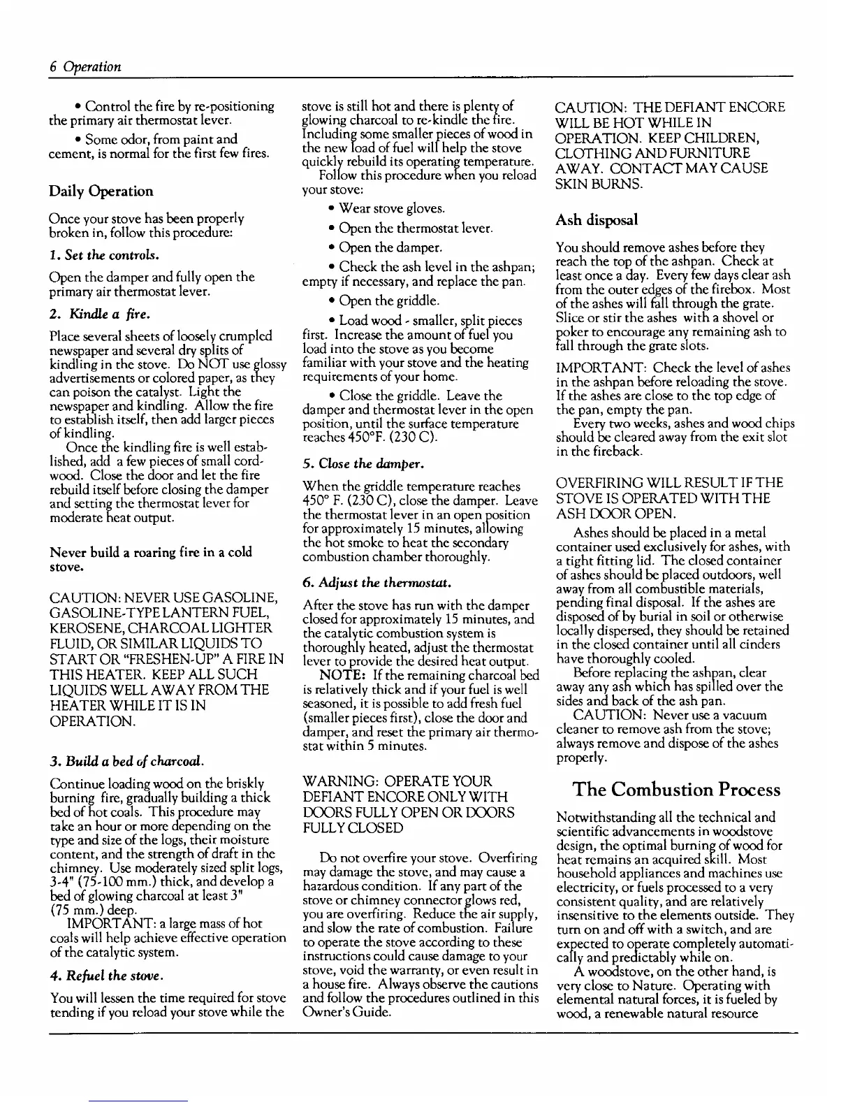 Defiant Encore 2140 - The Combustion Process; Daily Operation; Ash Disposal