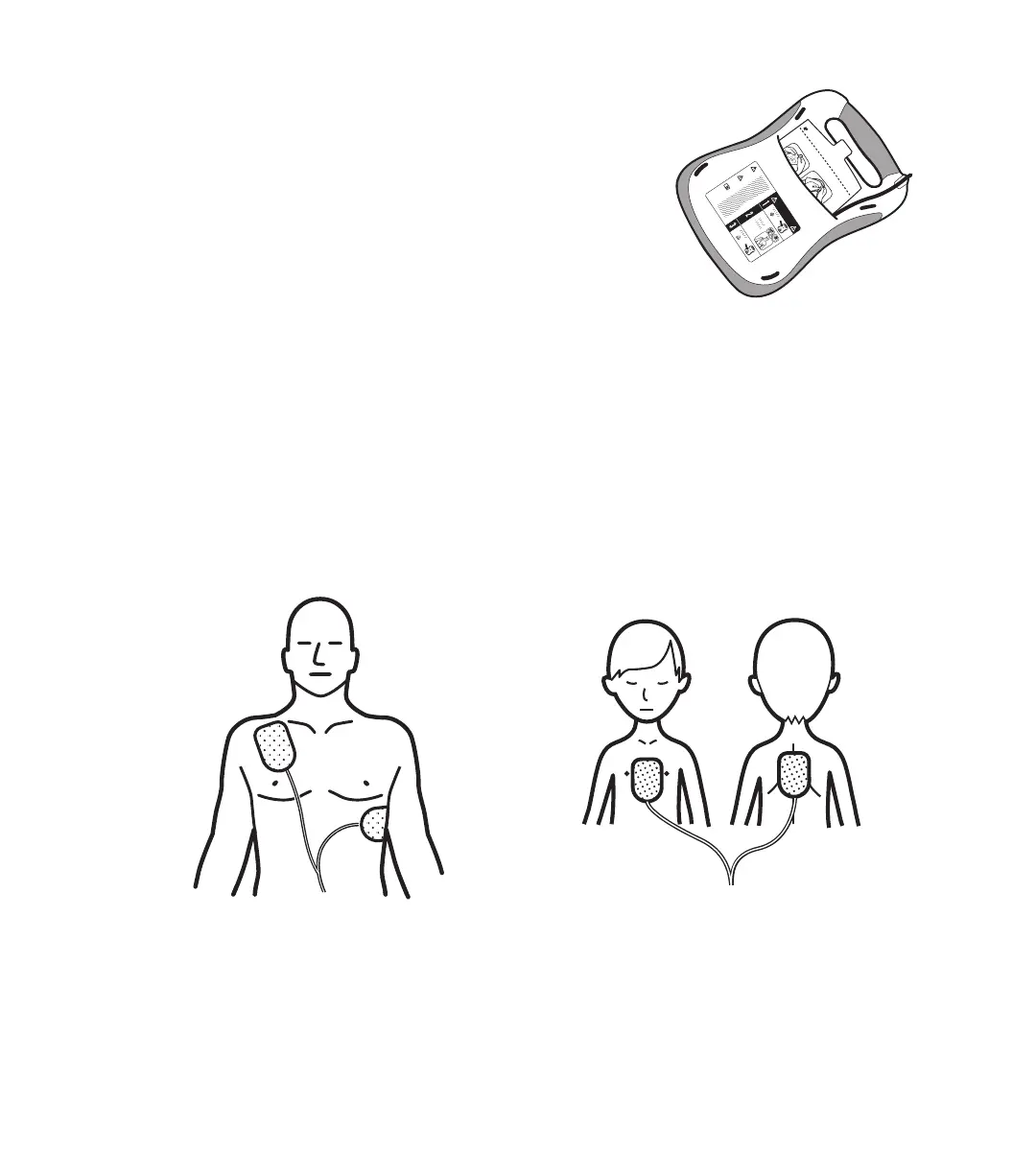 defibrillation pad package. Peel off the protective backing from each pad before placing it as shown