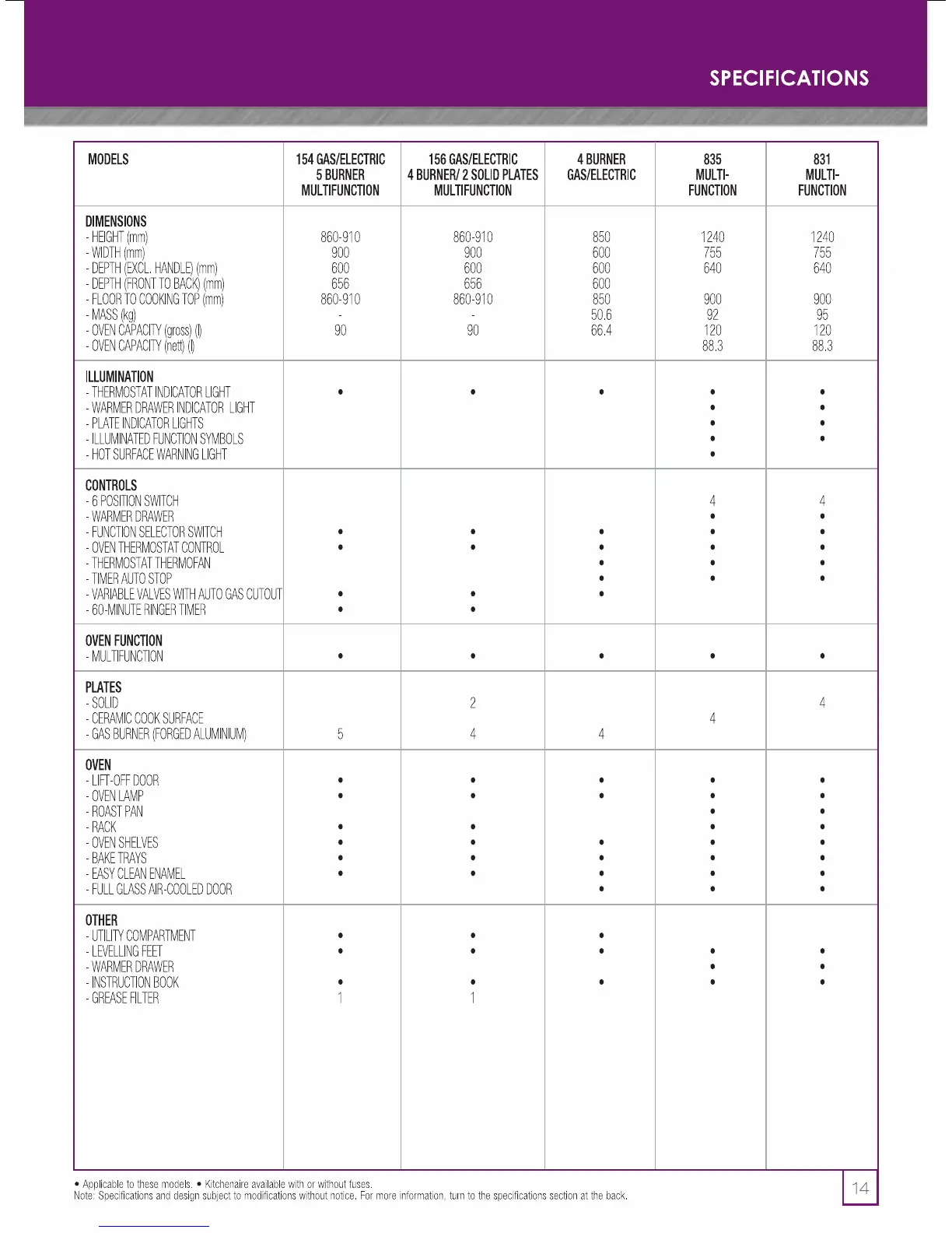 Defy 835 - Specifications; Gas;Electric & Electric Stove Specifications (Models 154-831)