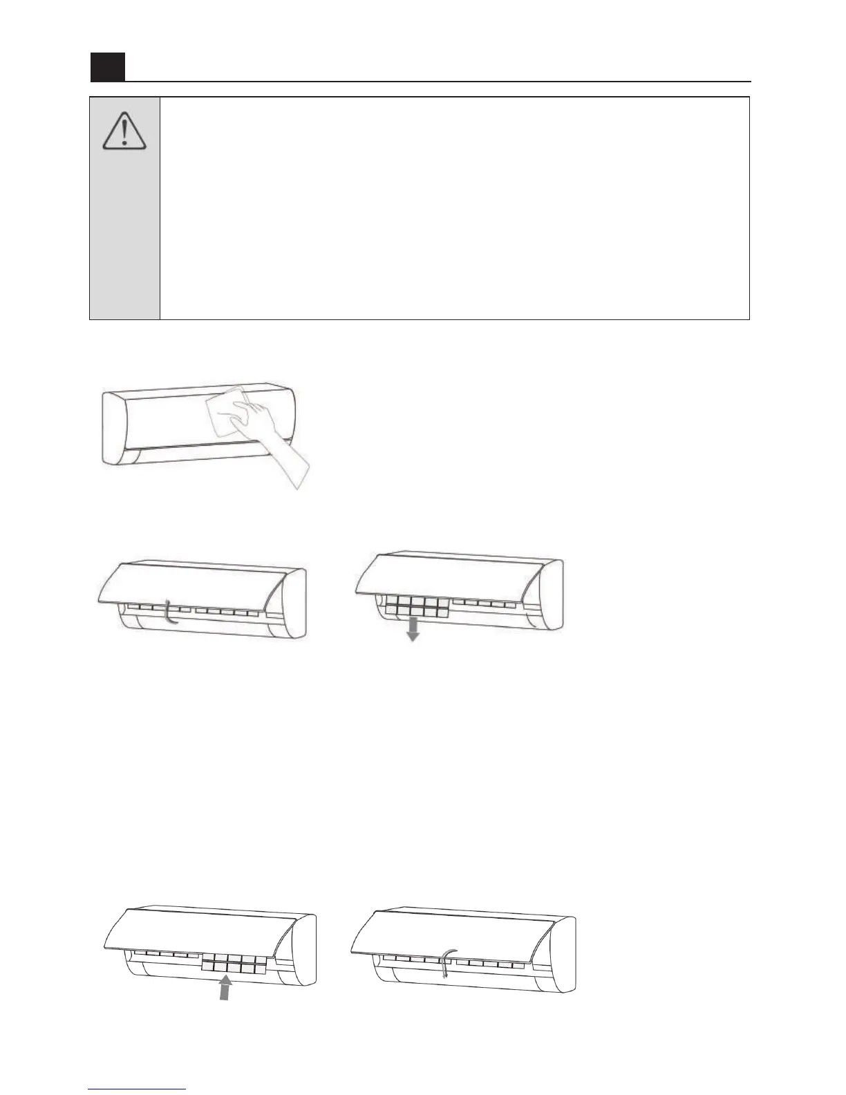x Before cleaning the air conditioner, it must be shut down and the electricity must