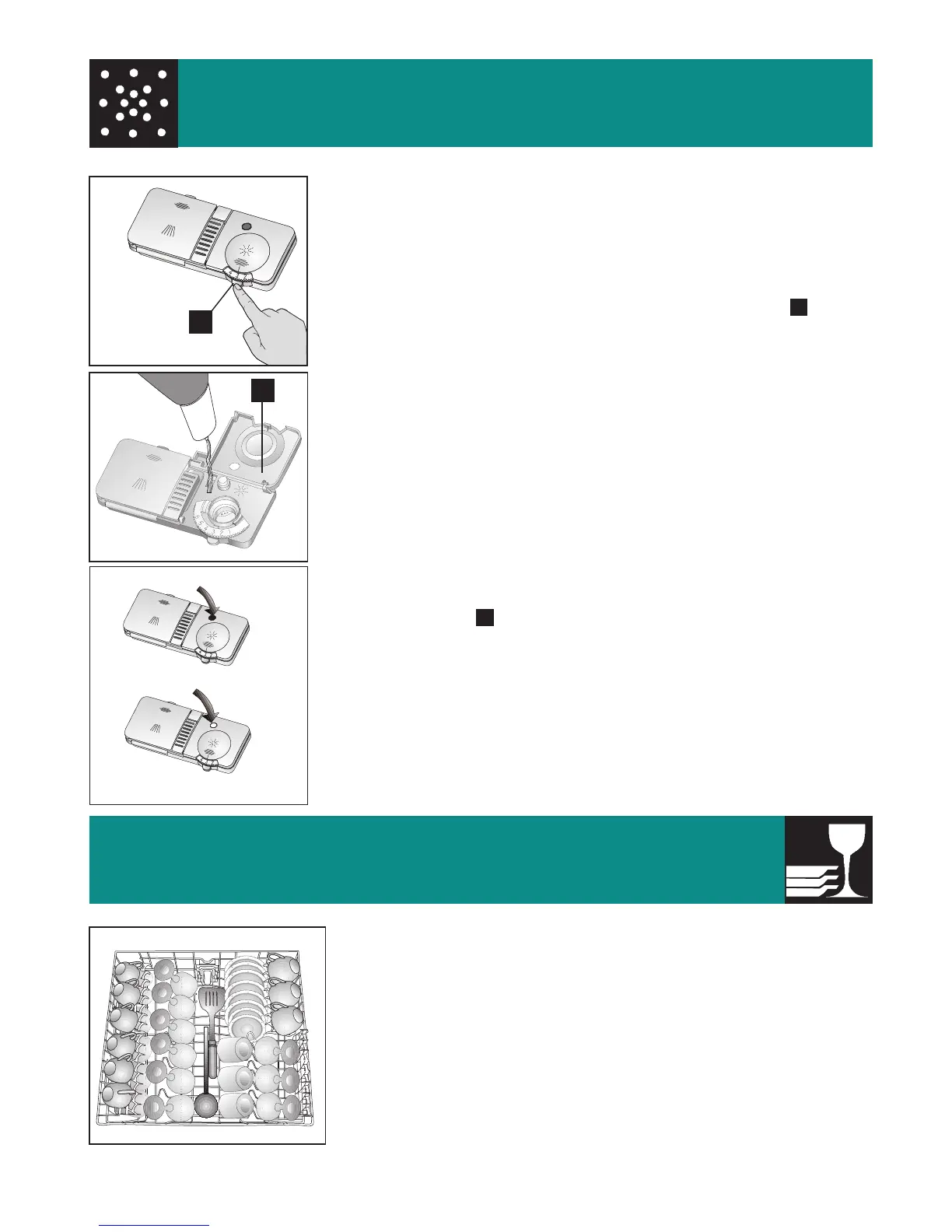 Open the rinse aid container lid by pressing on the tab