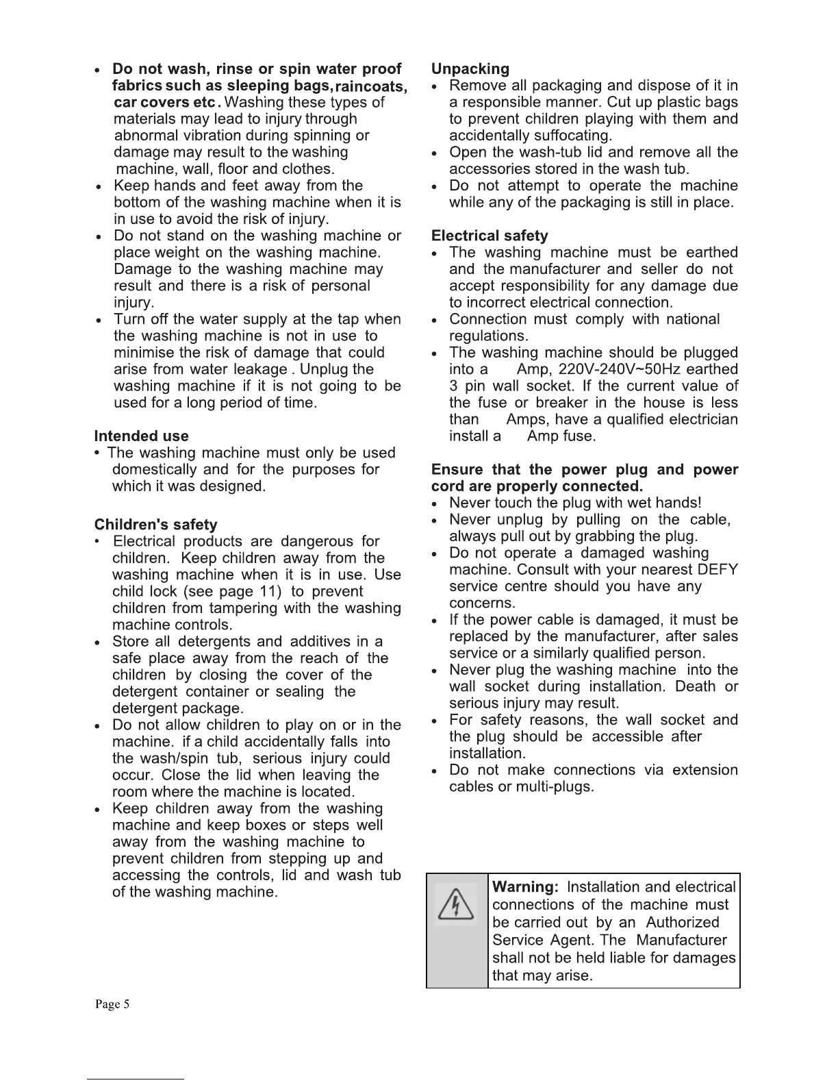 Defy DTL147 - Childrens Safety Measures; Electrical Safety Guidelines