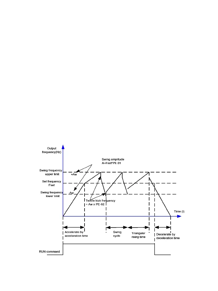 The swing amplitude is set in PE.00 and PE.01. When PE.01 is set to 0, the swing