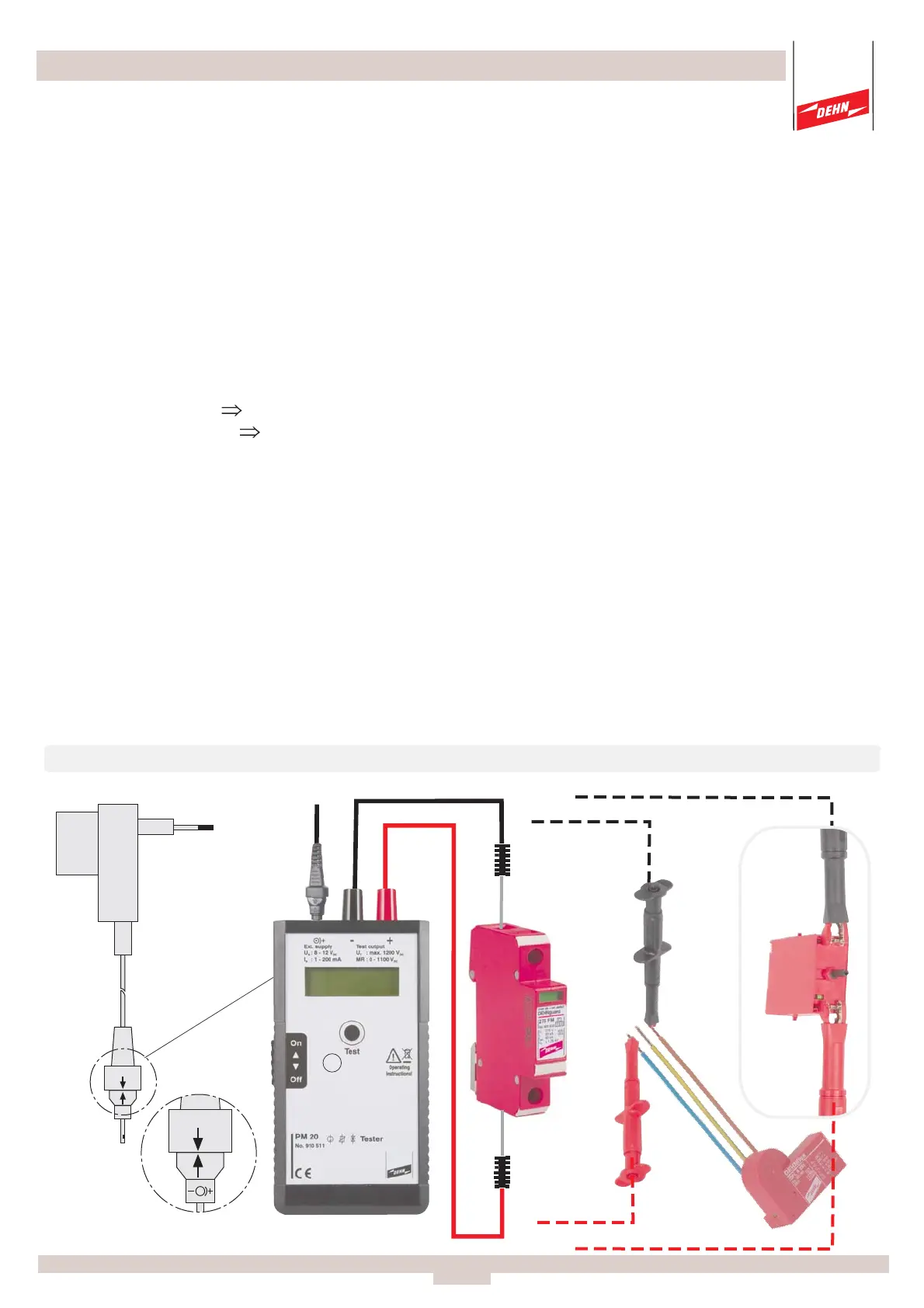 The PM 20 SPD tester, which has to be switched off, is connected via the test cables included