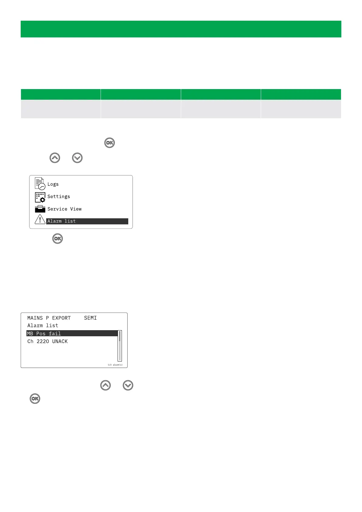 To see the other alarms, use the and buttons to go through the list. To acknowledge an alarm, select the alarm and push