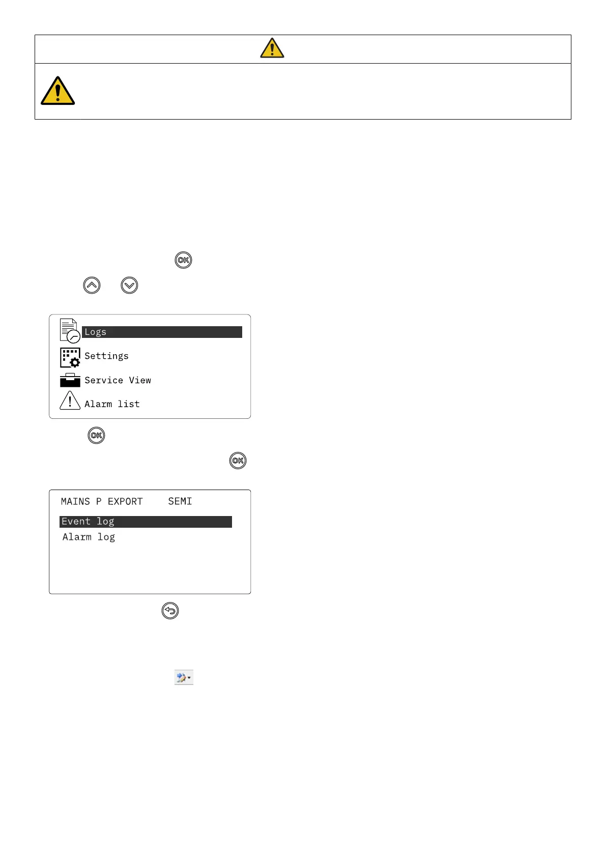 2. Alarm log: Shows up to 500 alarms. Only the latest 100 alarms are shown on the display unit, while the remaining alarms are