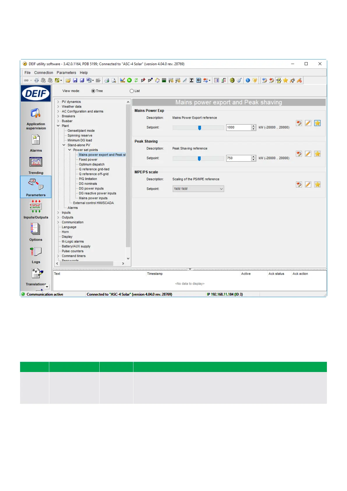 The set points during grid-tied operation are adjusted in the ASC. In the tree structure, the peak shaving, power export and fixed