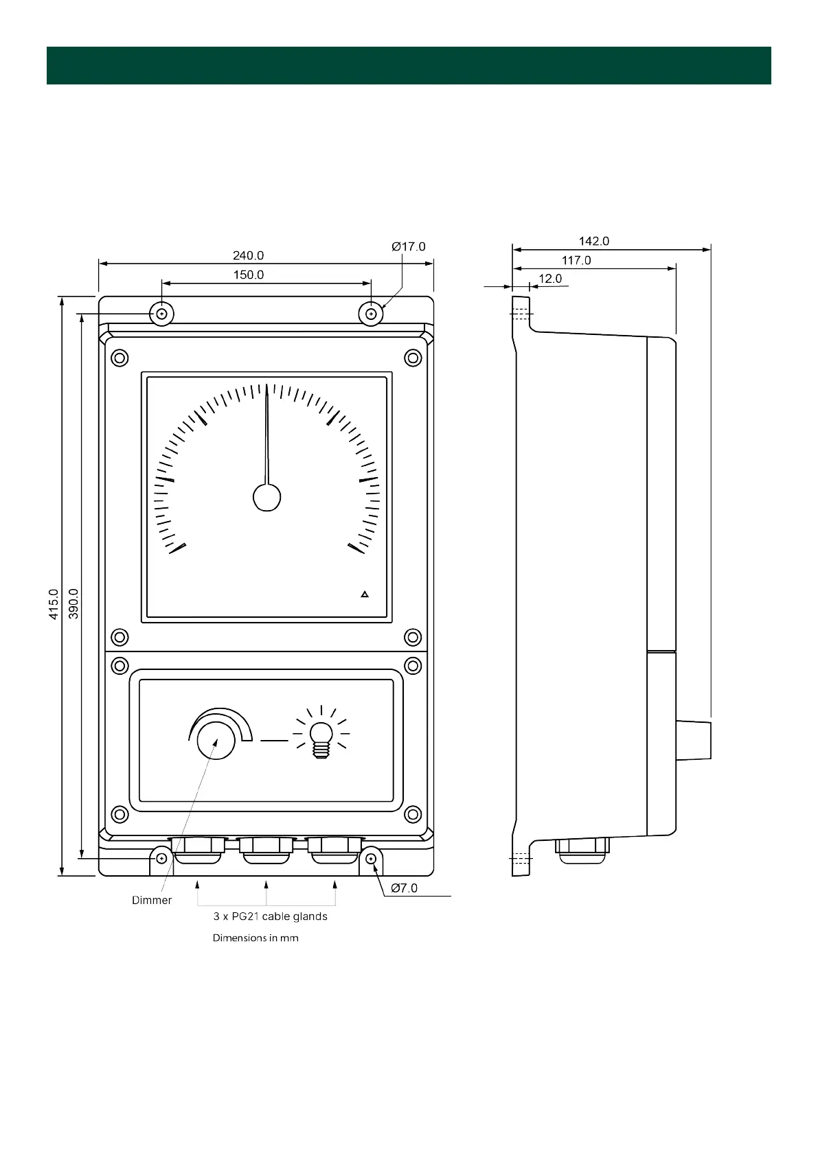 The three PG21 type cable glands on the bottom of the unit are suitable for cable gauge 13 to 18 mm.
