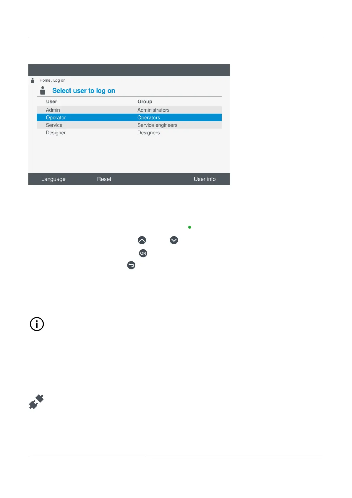 1. Select Log on, from the Home menu, to view the available users for the controller.