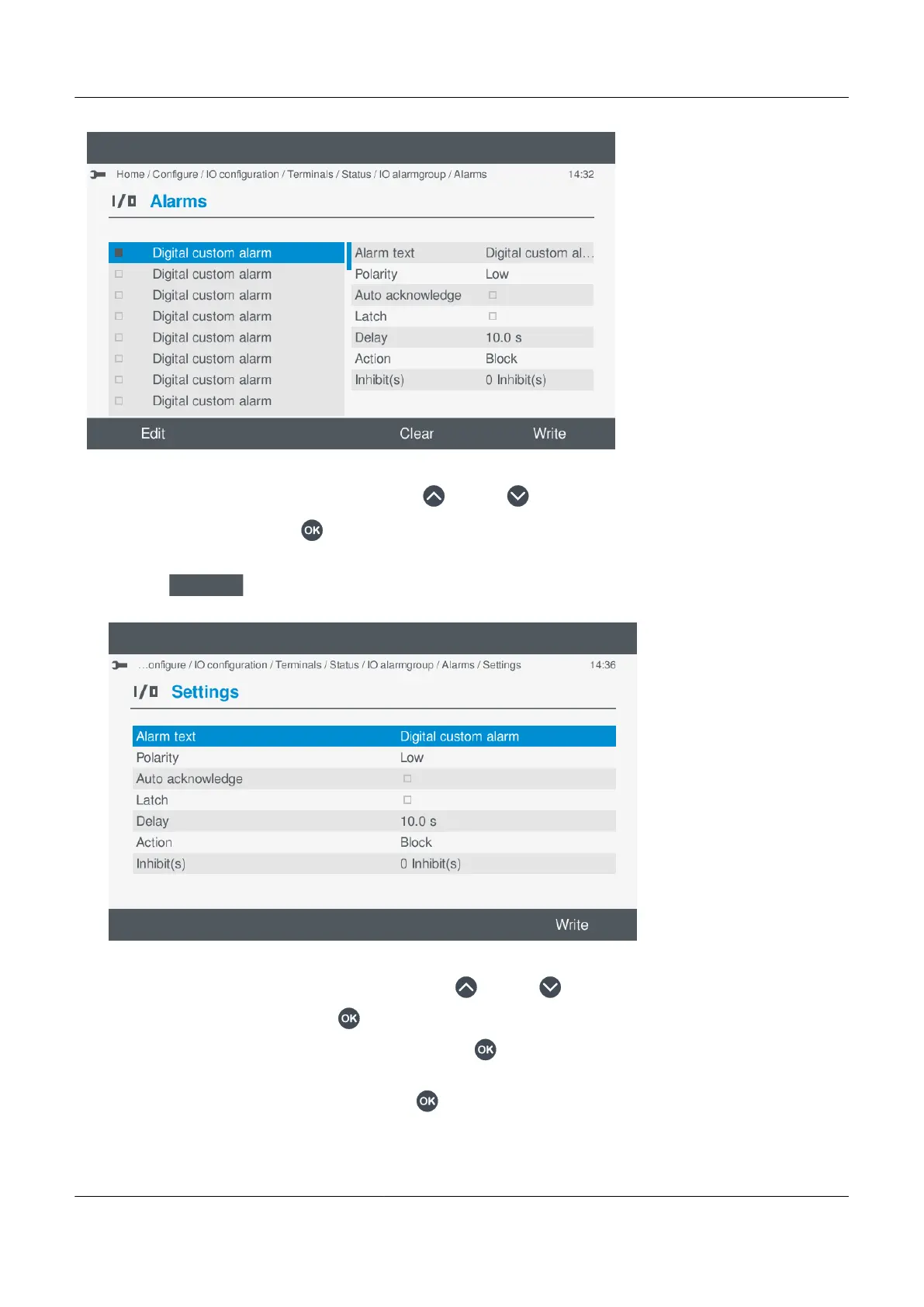 • Details of the alarm settings are shown on the display for you to configure.