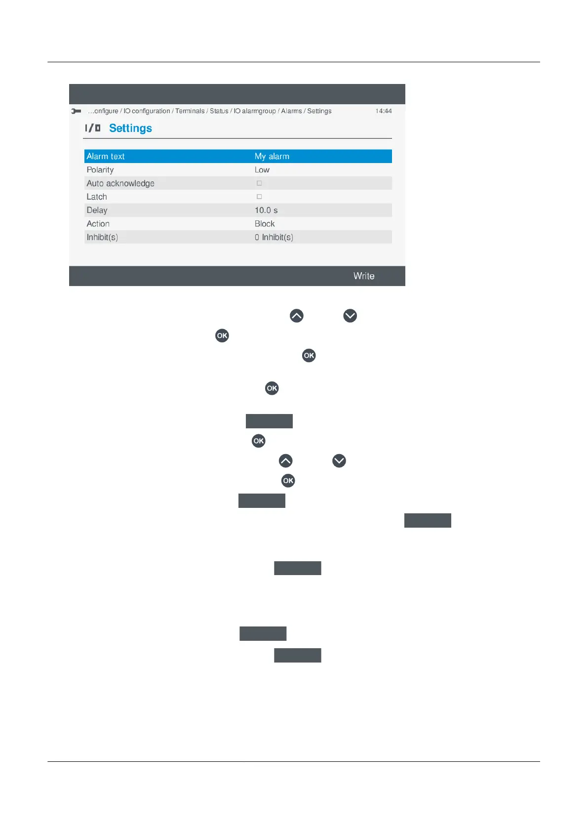 c. Once you have made all the required changes to the alarm settings, select Write
