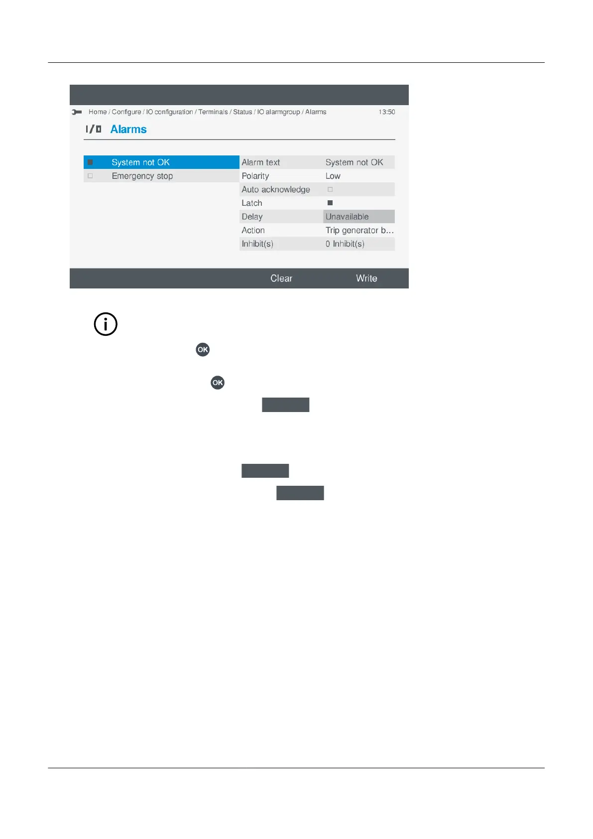 • This only saves the selected alarm(s) and their settings to the controller. It does not save other I/O settings.
