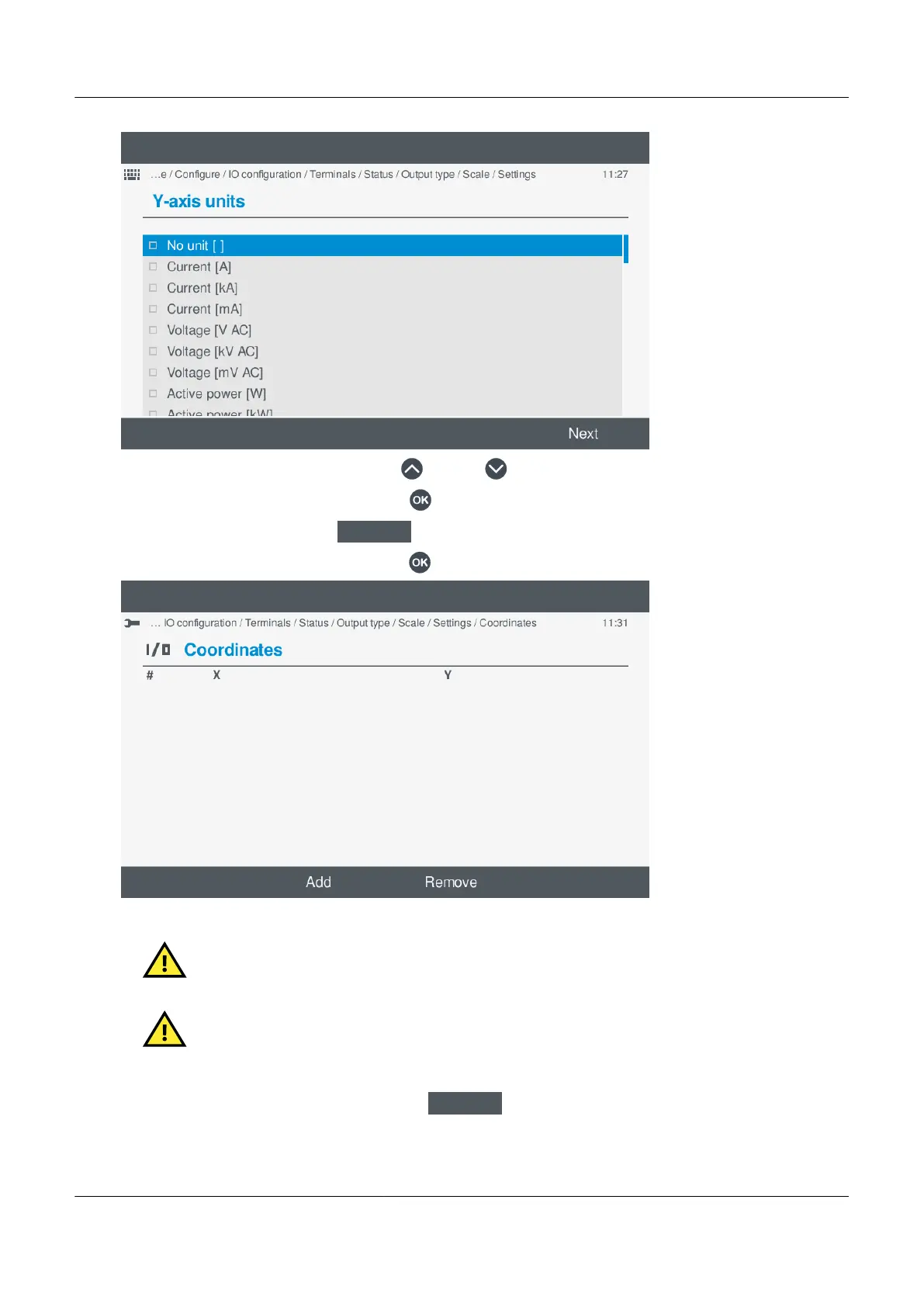 • If the setting is the x,y coordinates, pressing OK displays the coordinate options.