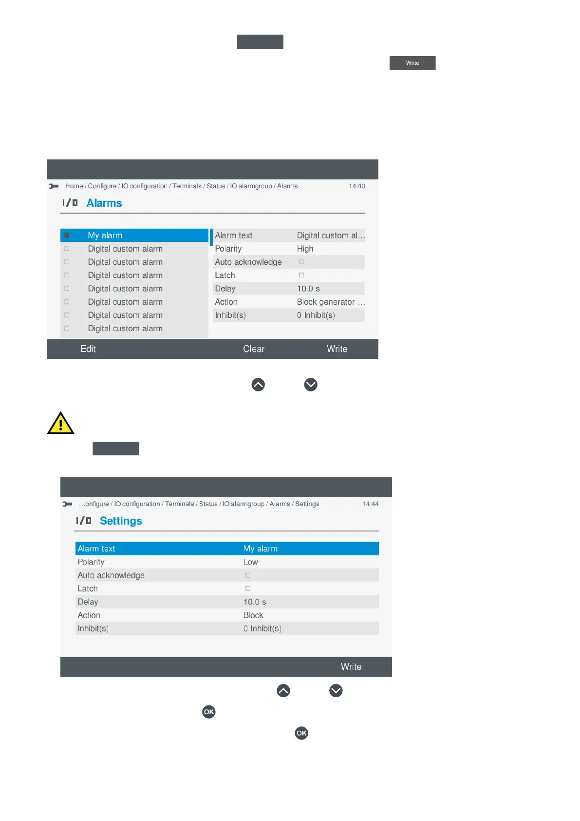 c. Once you have made all the required changes to the alarm settings, select Write .
