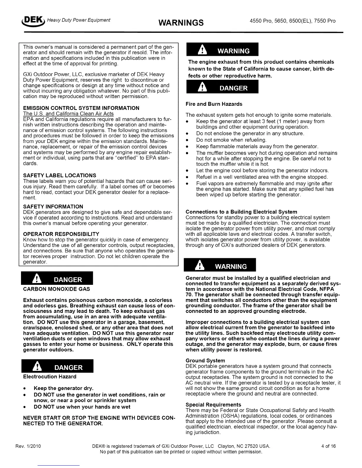 Heavy Duty Power Equipment WARN INGS 4550 Pro, 5650, 6500(EL), 7550 Pro